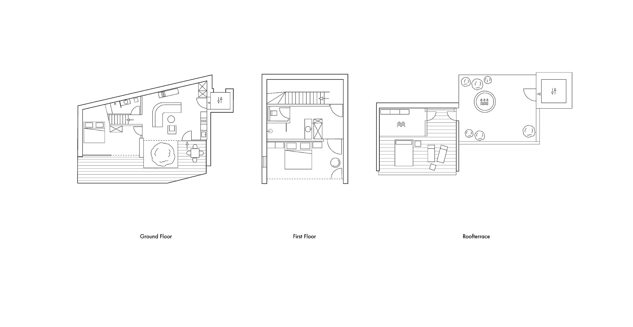 Erdgeschoss: Küchenzeile, Sessel und Sofa mit weichen Rundungen und zeitlosen Stoffen, Südterrasse mit Esstisch, 1 Zimmer mit Doppelbett, 1 Bad mit Walk-in Shower und WC.