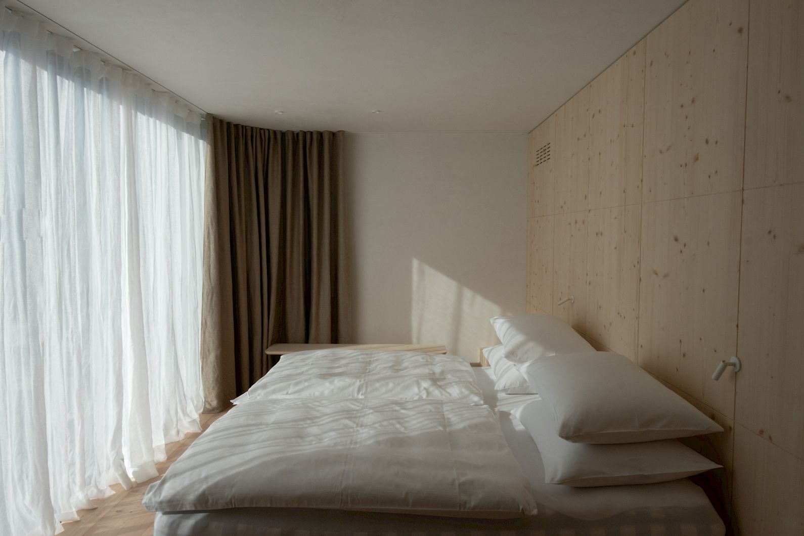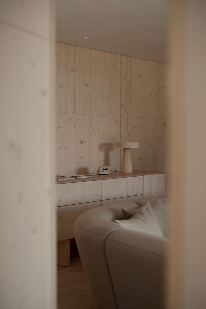 Mit hellem naturbelassenem heimischem Fichtenholz und rötlichem Porphyr.