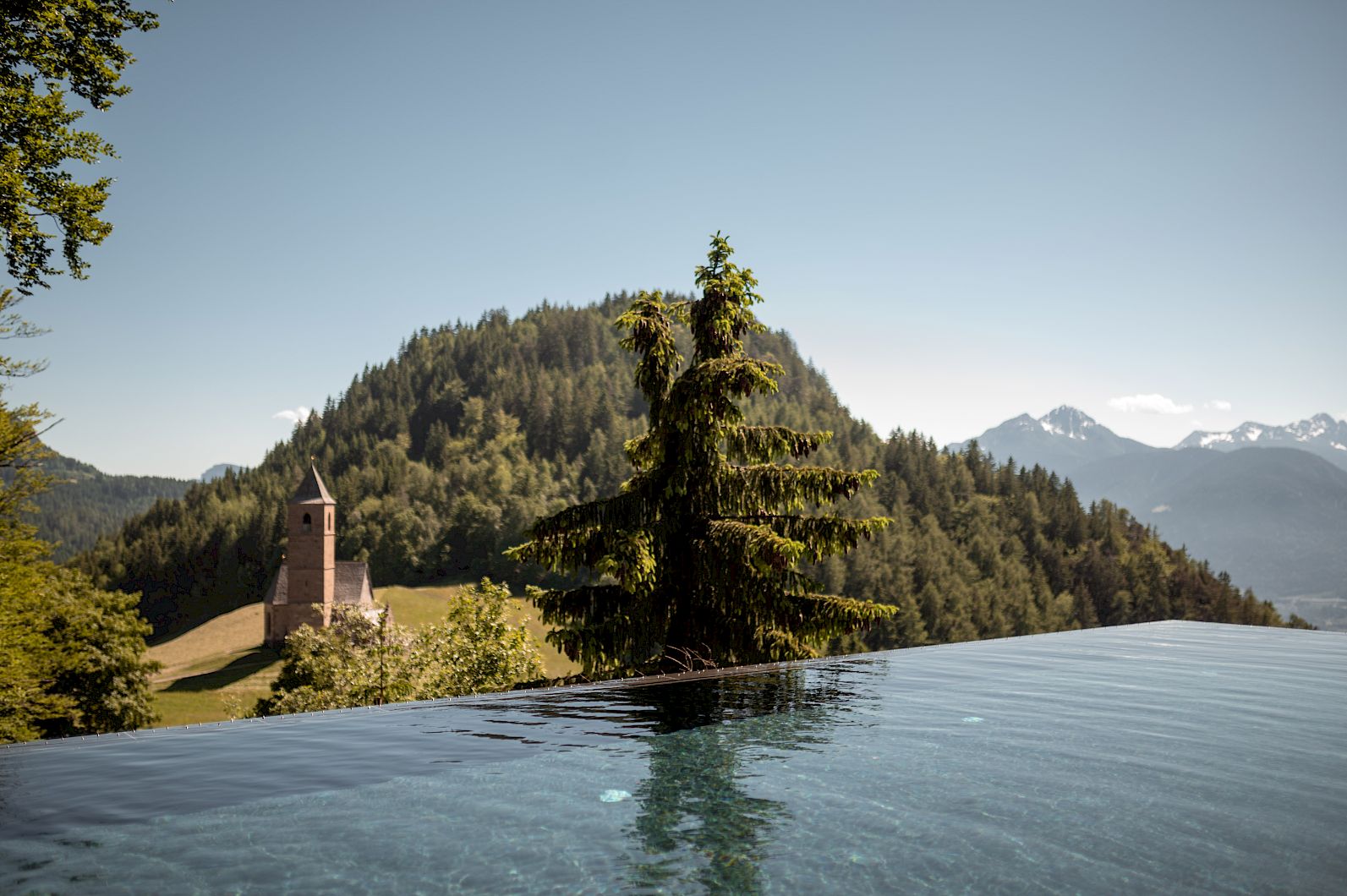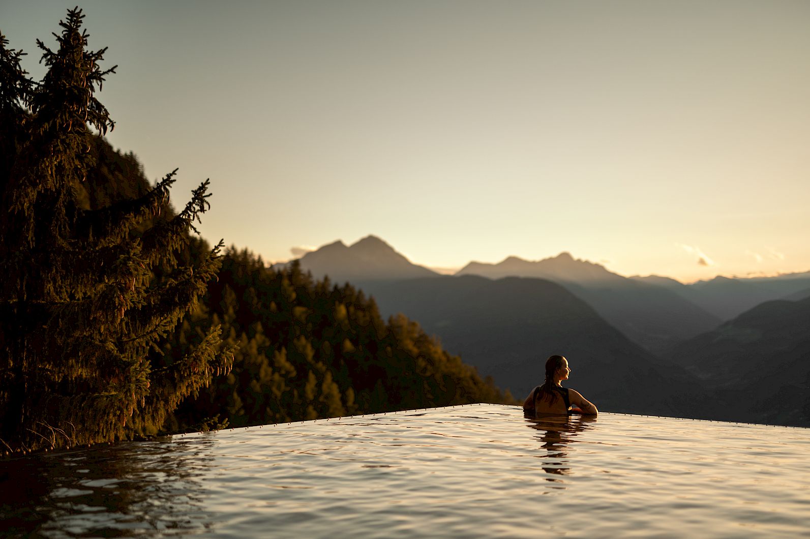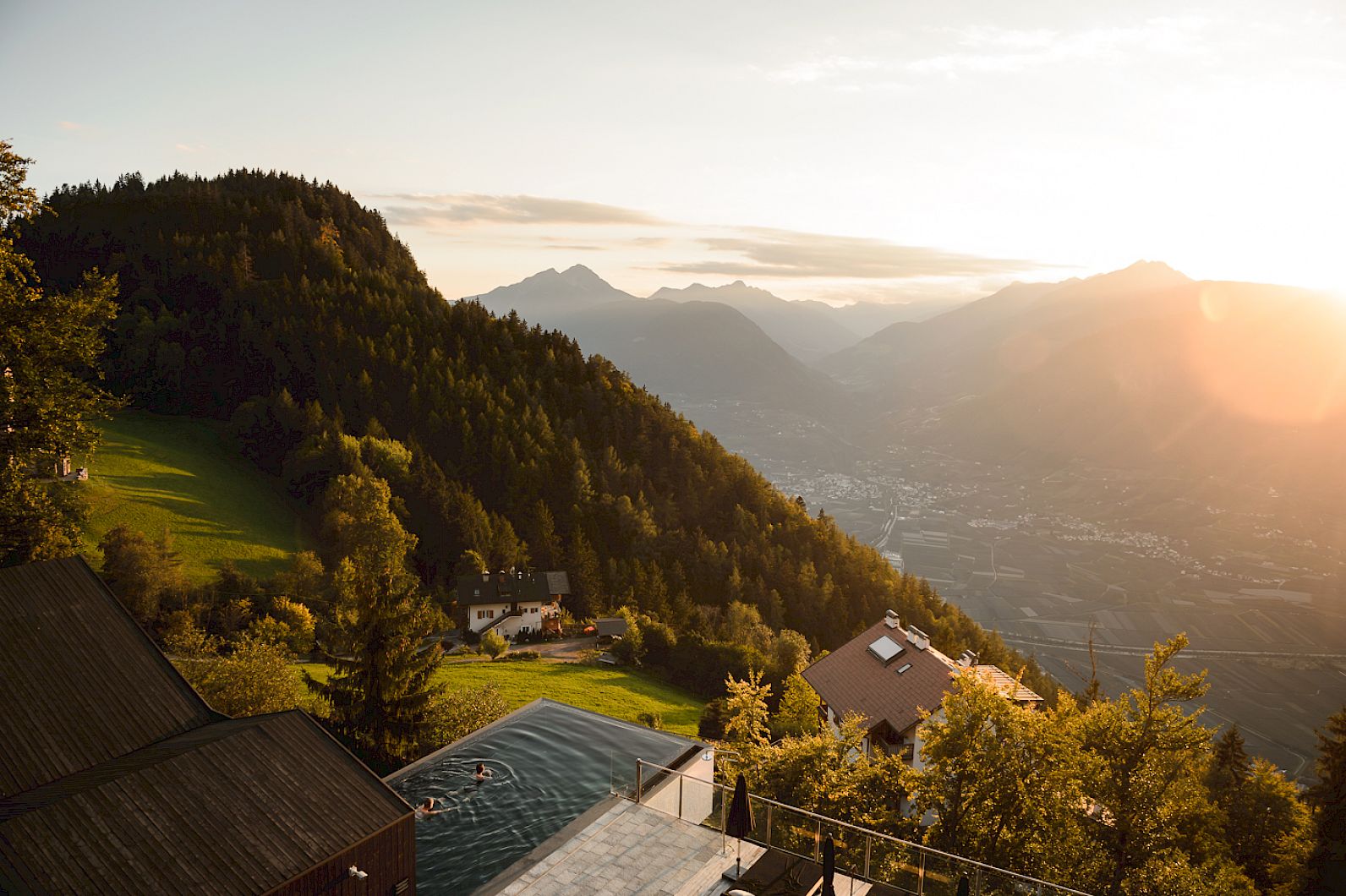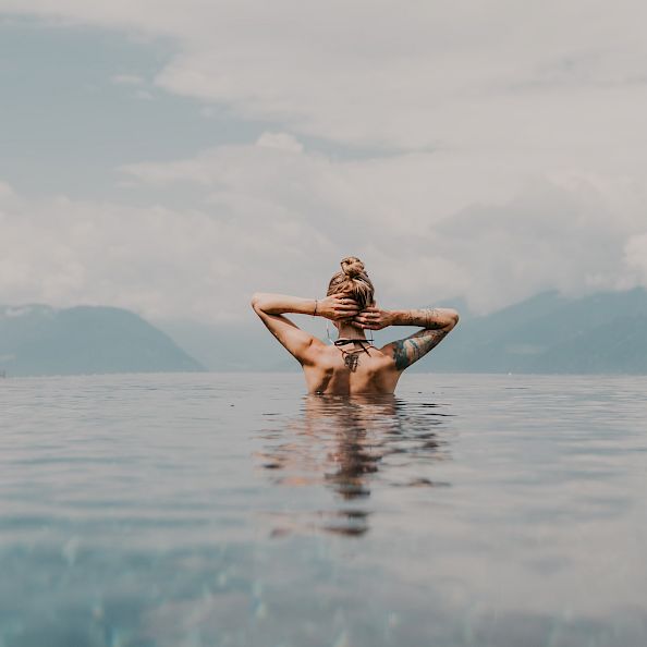 16 Meter lang und fünf Meter breit führt der Pool wie durch eine warme Höhle in allen vier Jahreszeiten auf die beeindruckende Landschaft zu. Verwöhnt mit mindestens 32 °C warmem, heilsamem Solewasser (ganzjährig geöffnet). Und ragt dabei schwebend wie eine spektakuläre und ebenso private Panoramalounge hoch über den Meraner Talkessel hinaus. Das ist Floating de luxe.