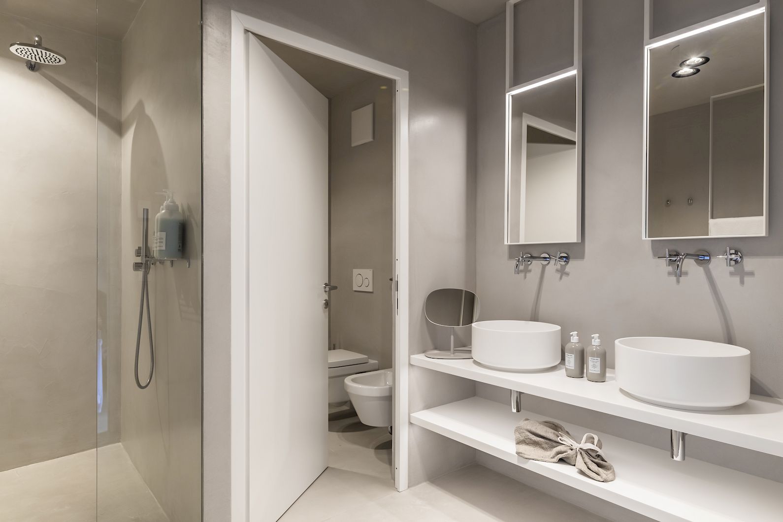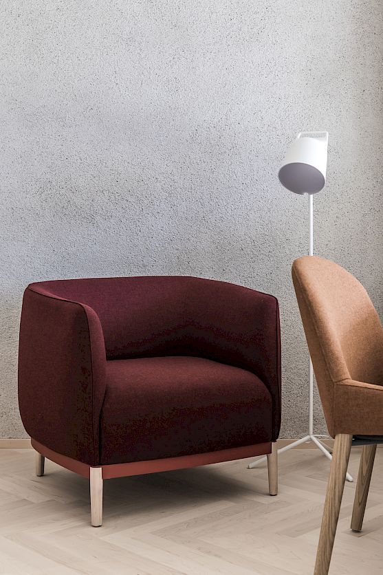 The bed faces the floor-to-ceiling glass front, desk, south-facing balcony, herringbone-laid wooden floor, cement plaster, upholstery and armchairs with original Mössmer fabrics and lamps by South Tyrolean designer Debiasi Sandri.