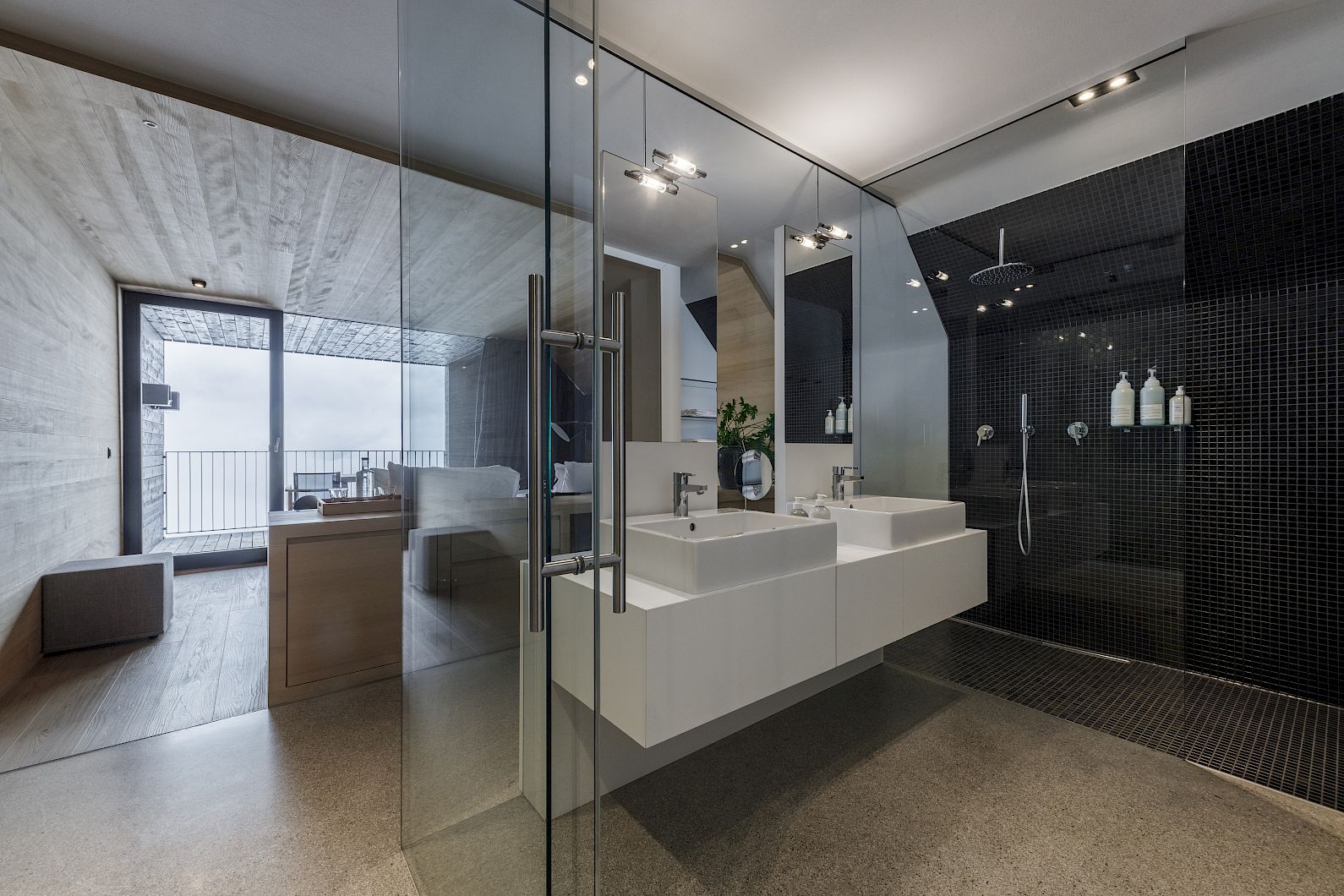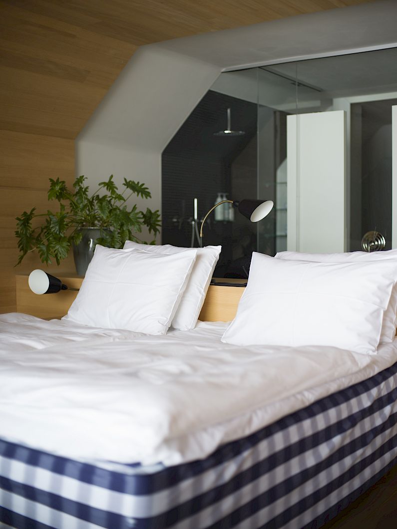 With the handmade Hästens XL bed opposite the floor-to-ceiling glass front, south-facing balcony, desk, open-plan bathroom, local silver fir, polished concrete floor, armchairs and lamps by &Tradition - a company from Copenhagen.