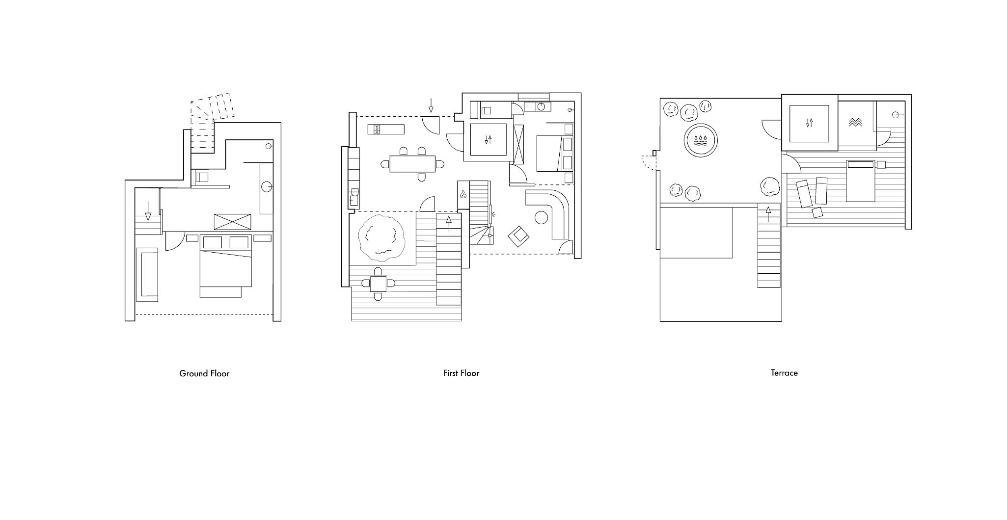 1st floor: kitchenette with dining table, open fireplace, armchair and sofa with soft curves and timeless fabrics, south-facing terrace with dining table, 1 bedroom with double bed, 1 bathroom with walk-in shower and separate WC.