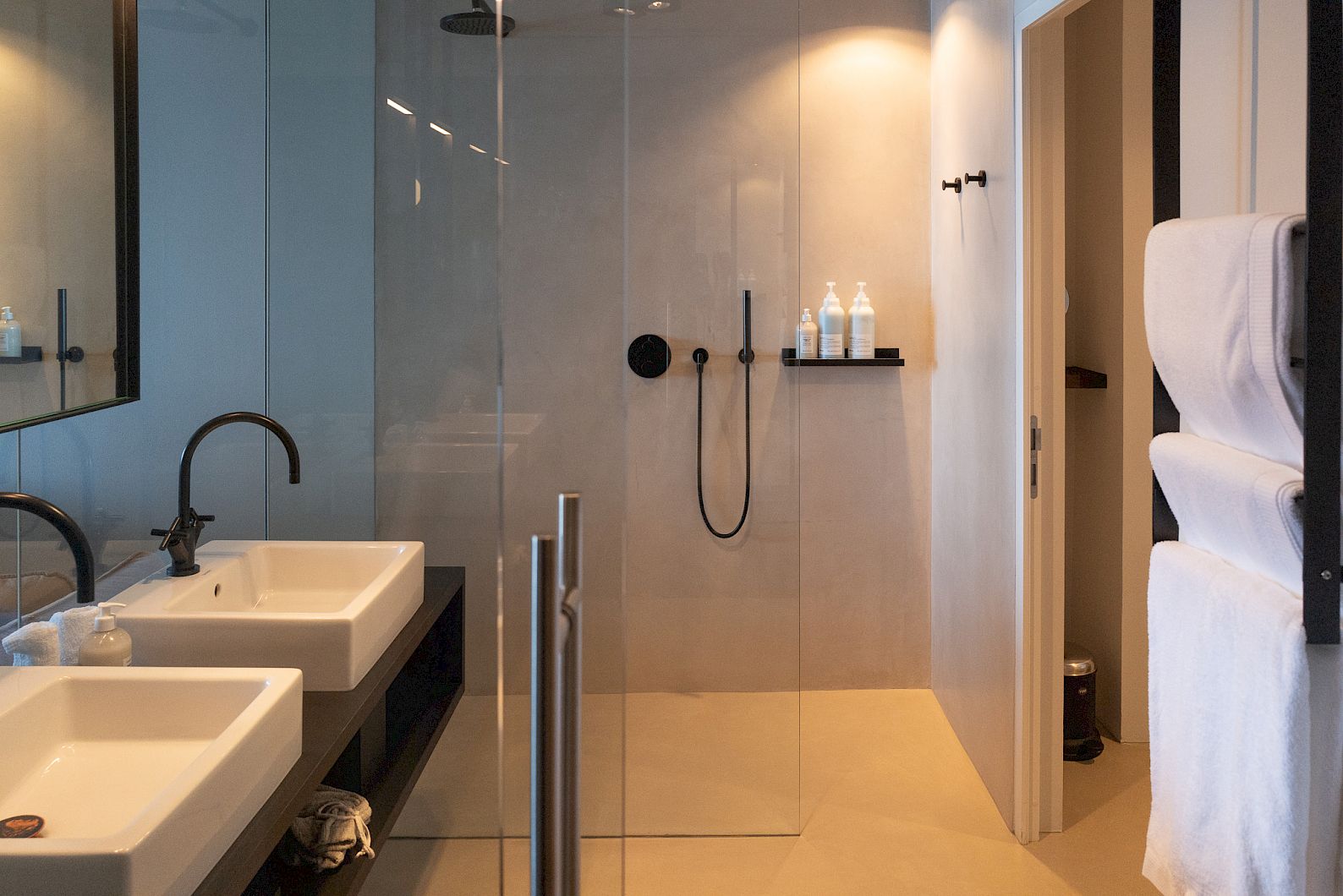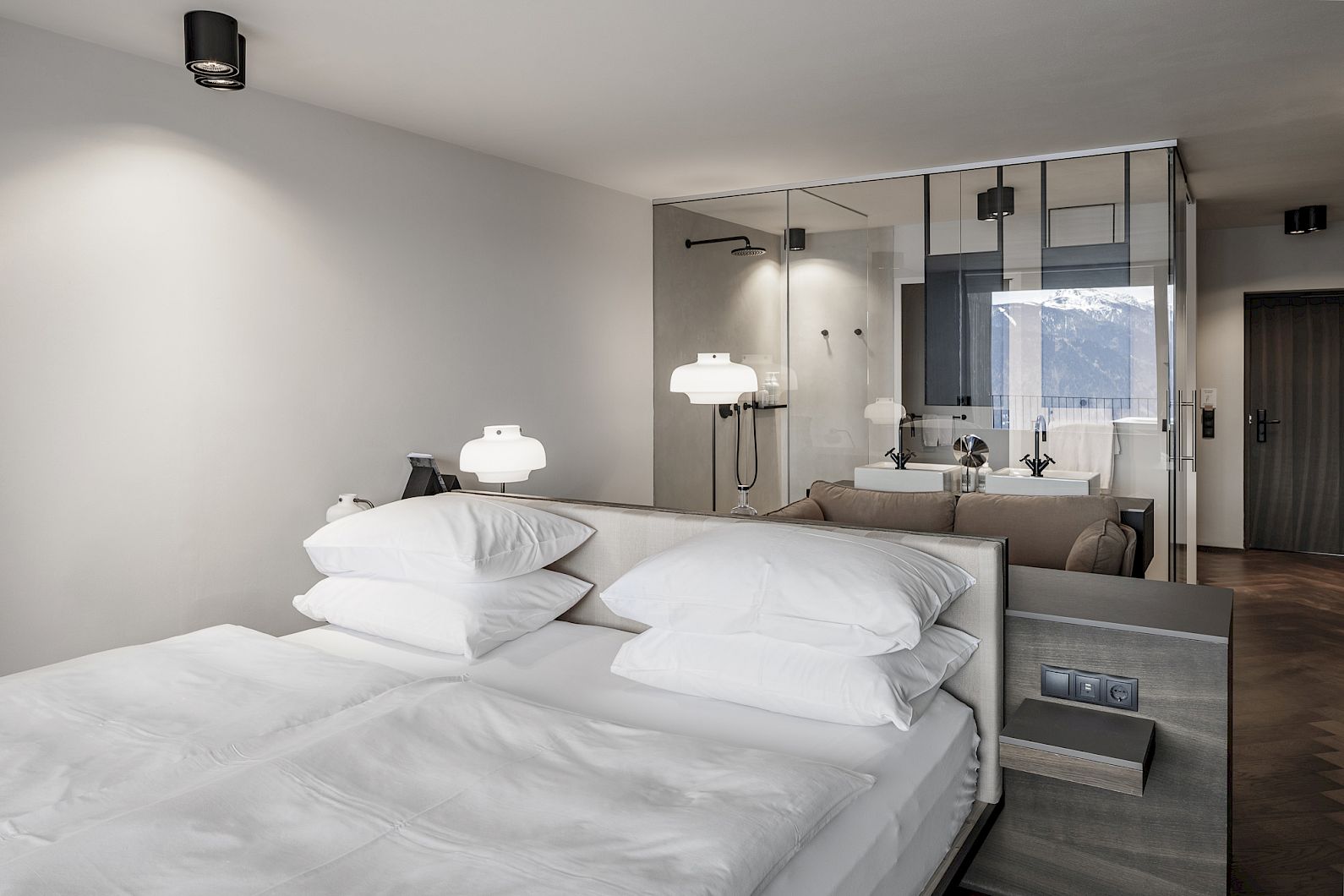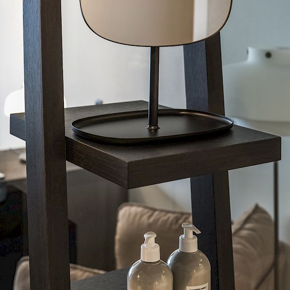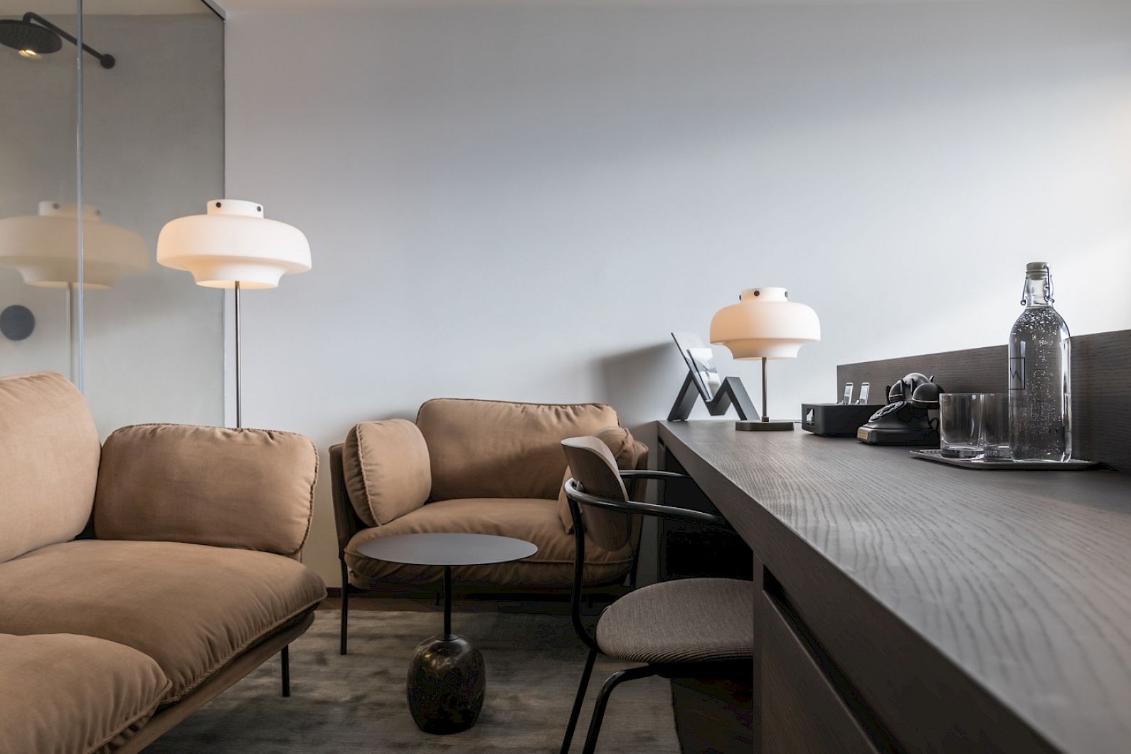 The bed opposite the floor-to-ceiling glass front, south-facing balcony, open bathroom, smoked oak with muted shades of green and rust. Armchairs and lamps by &Tradition - a company from Copenhagen.