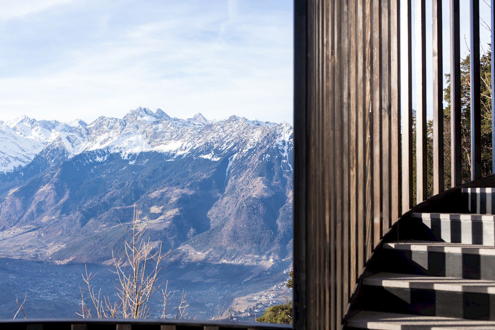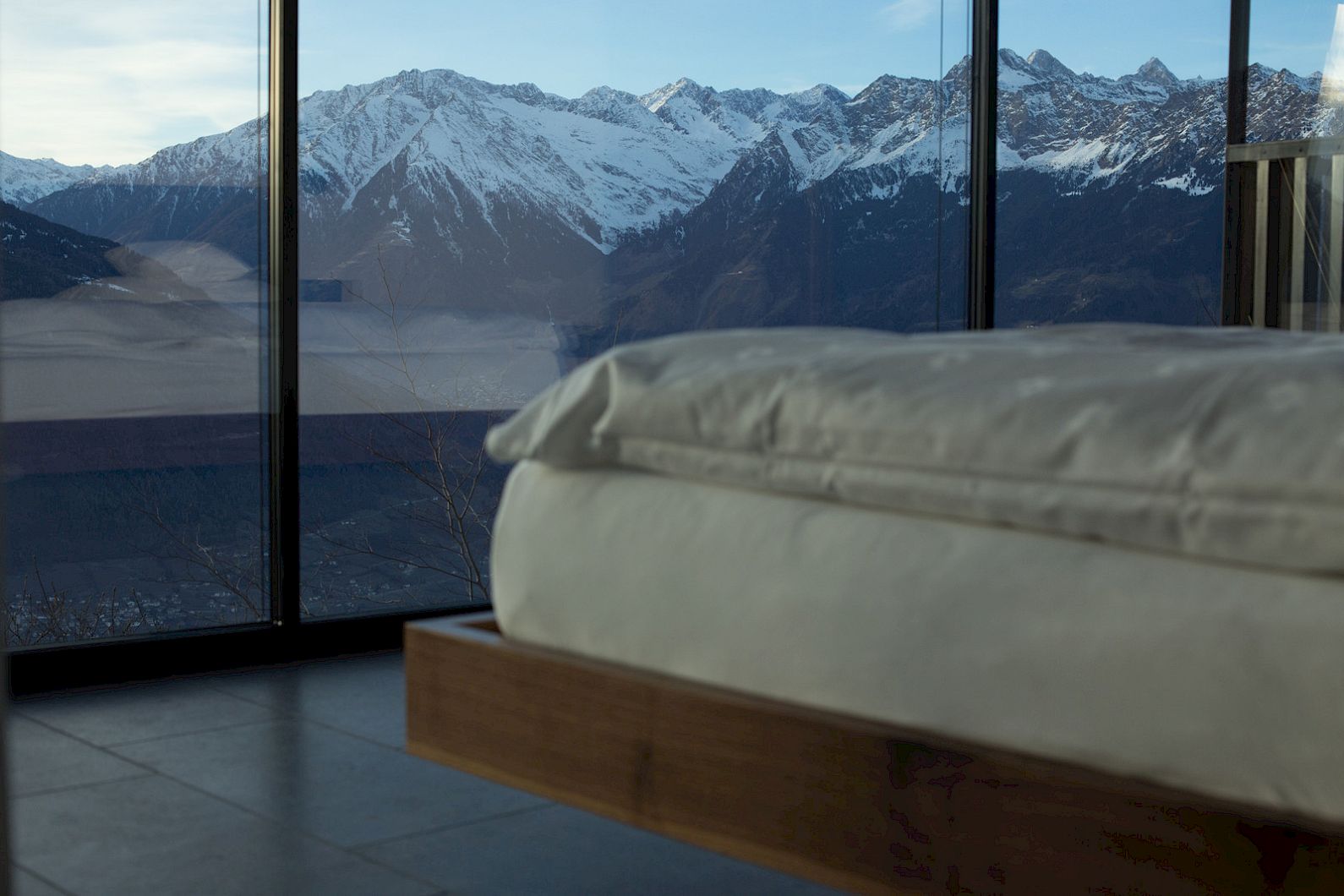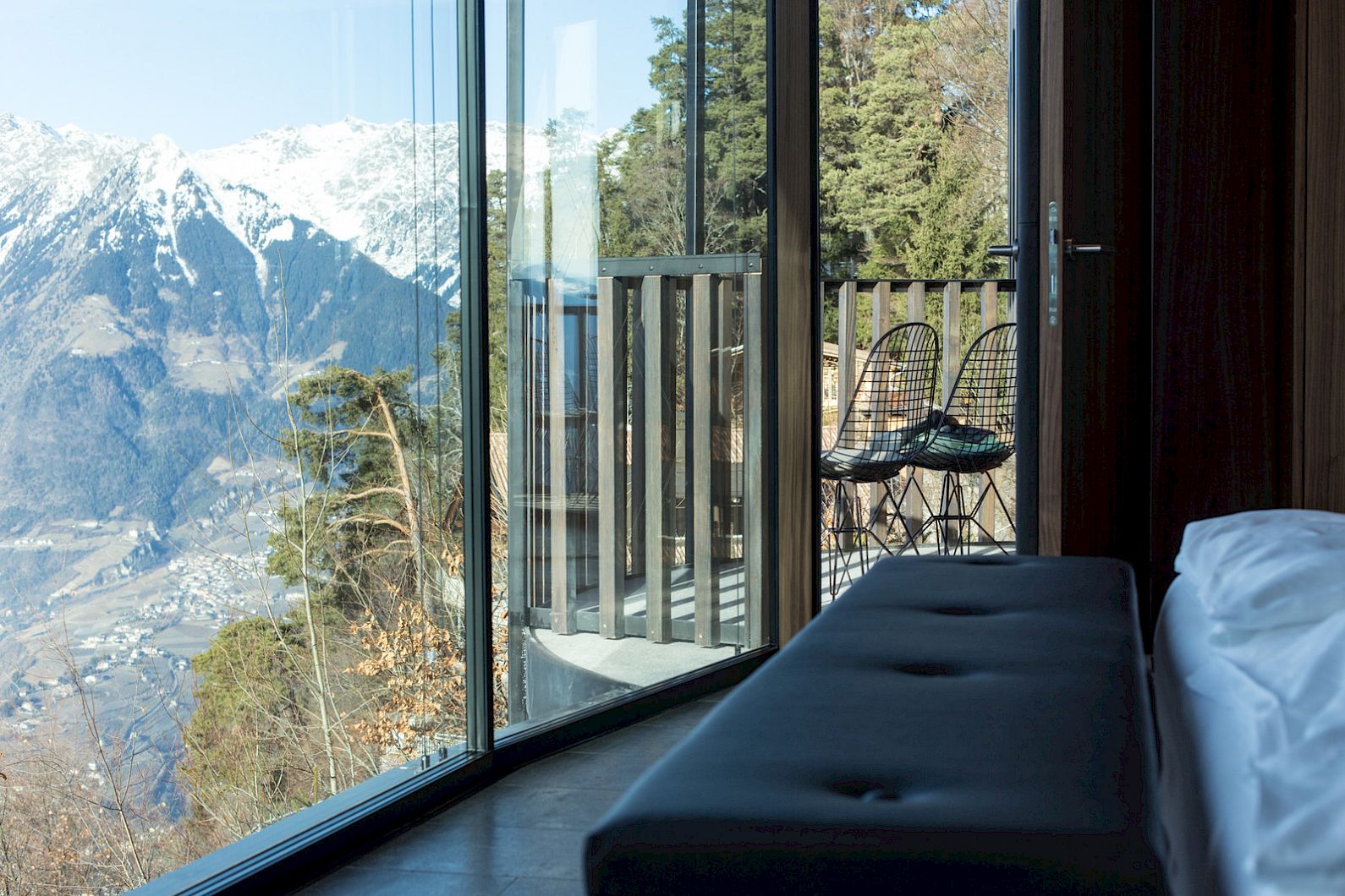 Ispirata a "Q", l'armeggiatore di 007, la nuova suite maschile è costruita su 42 metri quadrati al piano terra su roccia. Il letto galleggiante in legno è esposto a sud e si trova di fronte alla vista più bella attraverso la finestra larga 12 m di fronte alle montagne - svegliatevi con una vista panoramica. Altre particolarità sono i mobili Vitra Design, l'armadio bar in legno di noce, i rivestimenti murali con pelle conciata a mano, il pavimento in pietra porfirica locale e il balcone che sporge sul ripido pendio. Il moderno bagno con cabina doccia a pioggia offre una vista sulla città di Merano - docce con osservazione della natura.