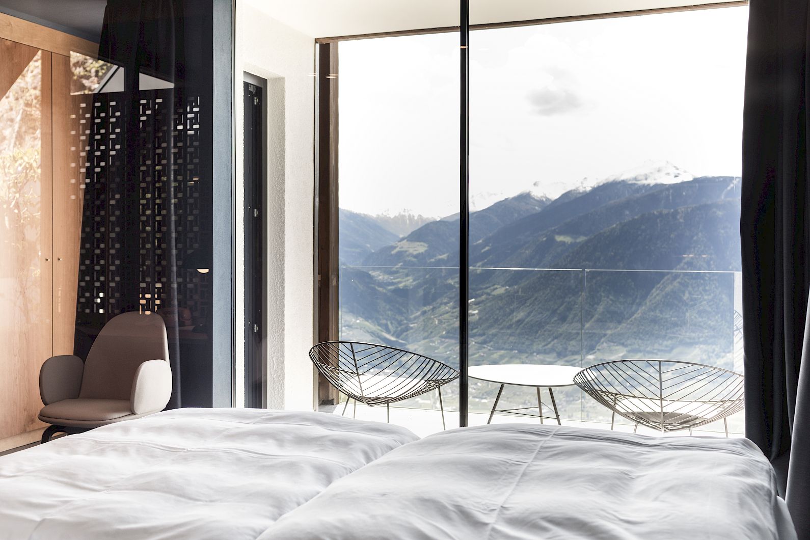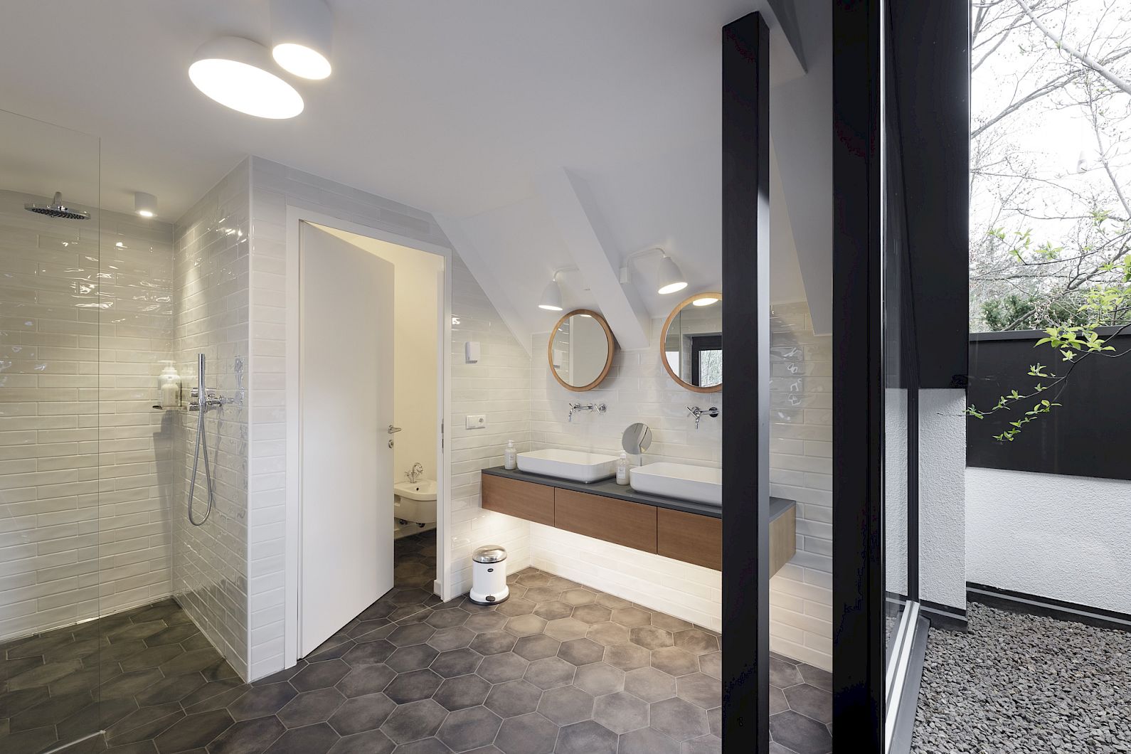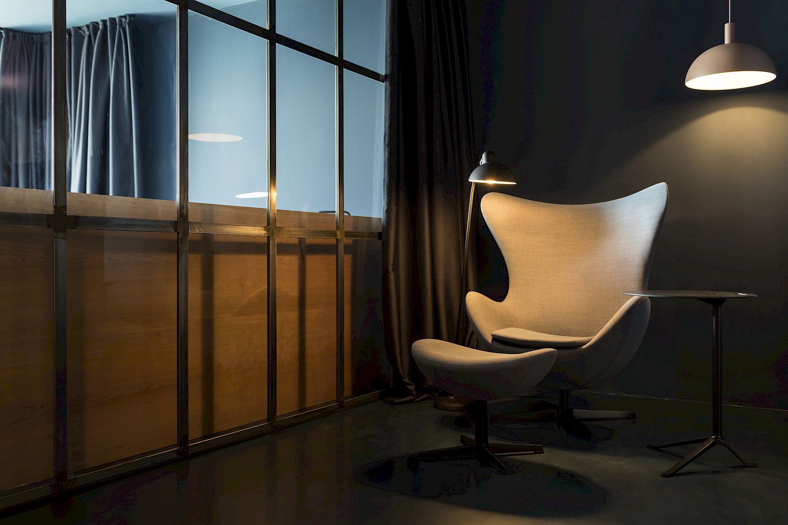 Esperienza bilocale, il legno di ciliegio incontra l'elegante blu notte, il letto di fronte alla vetrata a parete, balcone in vetro rivolto a sud, scrivania, bagno a pianta aperta, mobili originali Fritz Hansen, Egg Chair, divano letto, giardino pensile con ciliegio e lucernario.