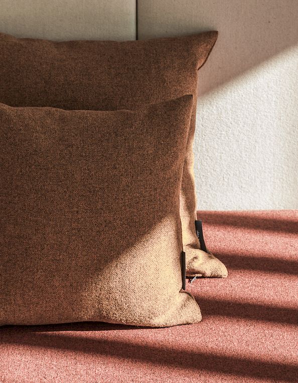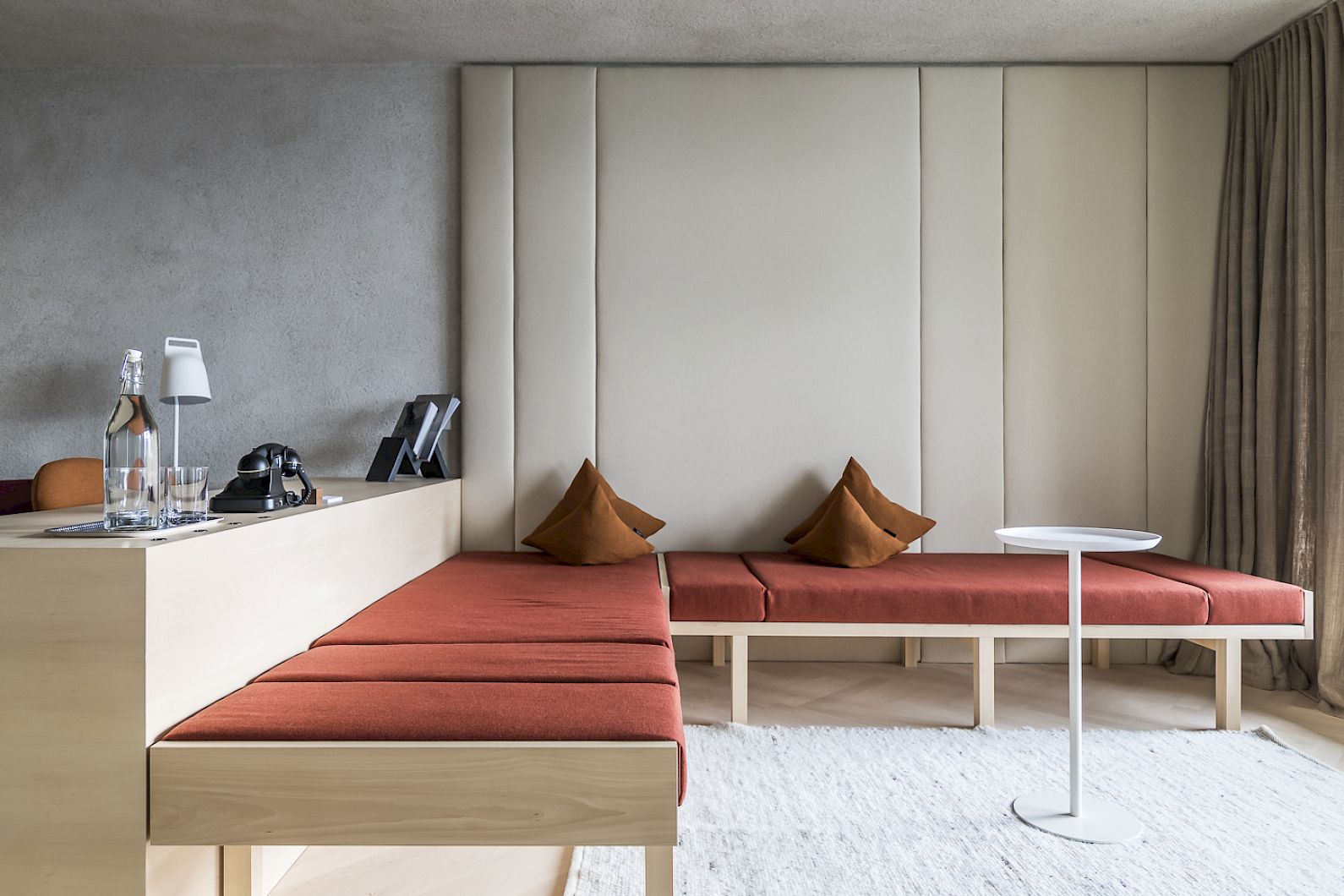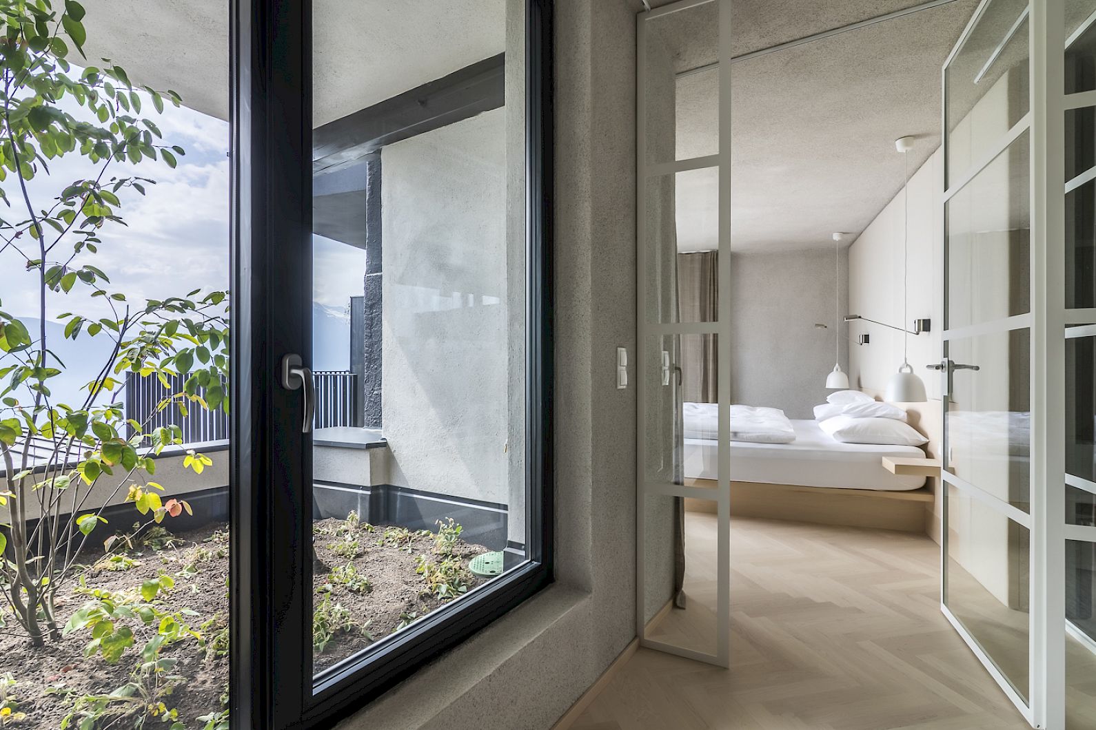 Esperienza bilocale, balcone esposto a sud con angolo verde privato, letto rivolto verso la finestra a parete, bagno con vasca autoportante, day beds per il relax, scrivania, pavimento in legno posato a spina di pesce, intonaco in cemento, rivestimenti e poltrone con tessuti originali Mössmer e lampade della designer altoatesina Debiasi Sandri.