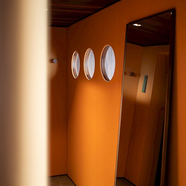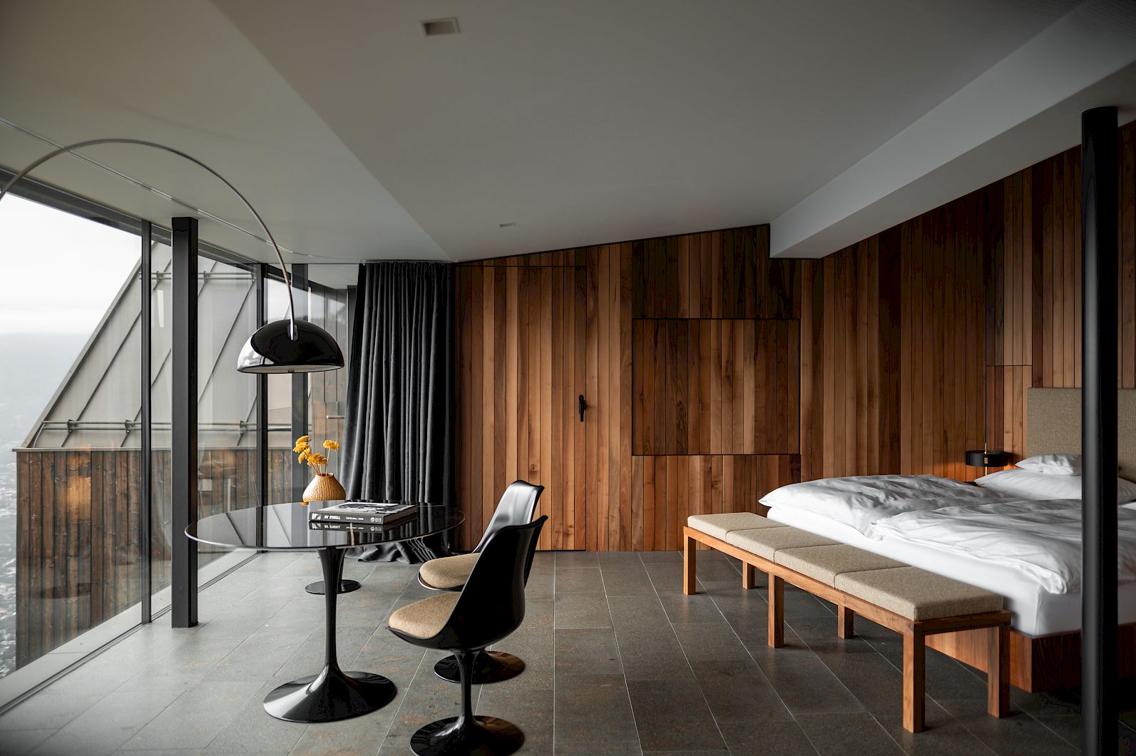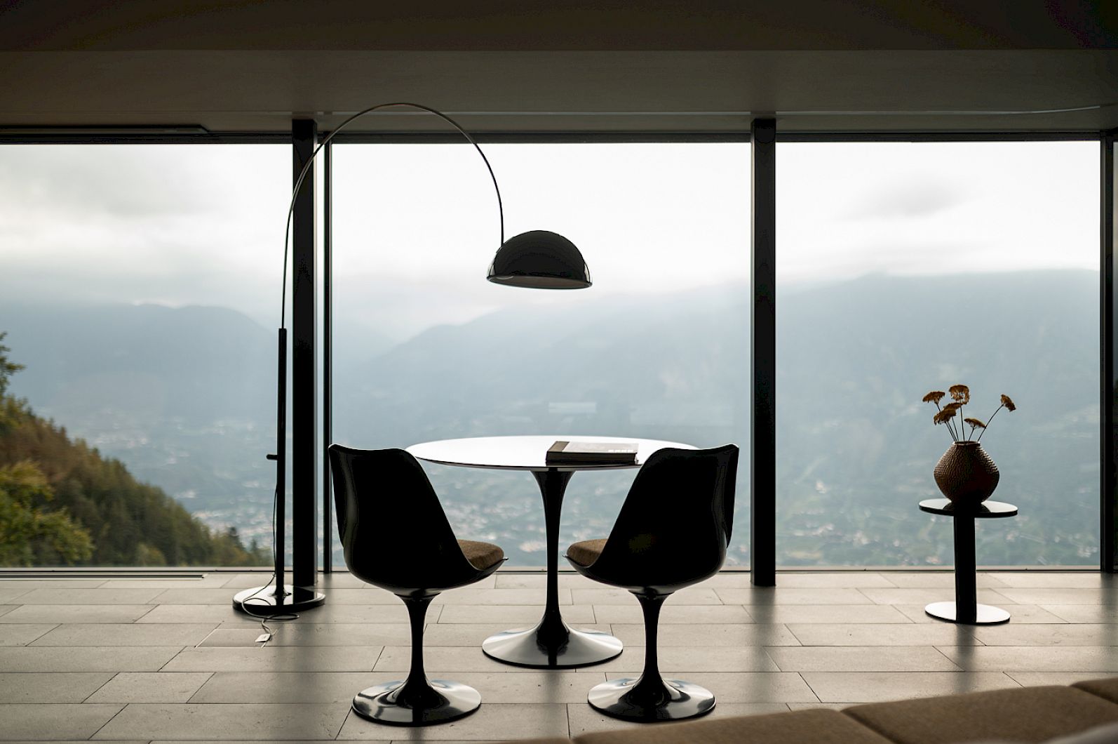 Rifugio all'ultimo piano della casa, terrazza esposta a sud con vasca idromassaggio privata, il letto al centro di fronte alla finestra a parete lunga 9 m, bagno con cabina doccia e vista sulla città di Merano, cabina bar in legno di noce, sedie classiche da salotto e tavolo da pranzo di “Knoll International”.