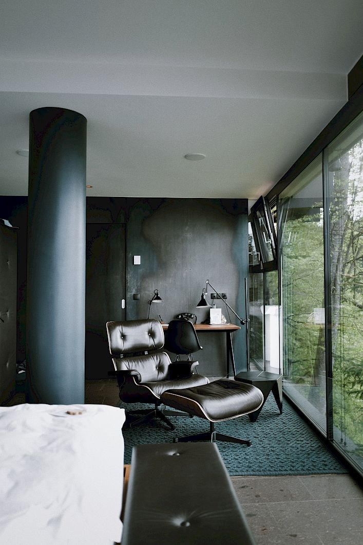 Attraverso la scala a chiocciola artigianale si accede alla suite, il letto al centro rispetto alla finestra a parete lunga 12 metri, le classiche poltrone lounge di “Vitra”, il bar in legno di noce, i rivestimenti delle pareti in pelle lavorata a mano, il pavimento in pietra porfirica locale, il balcone rivolto a sud che sporge sul ripido pendio, il bagno con cabina doccia e vista sulla città di Merano.