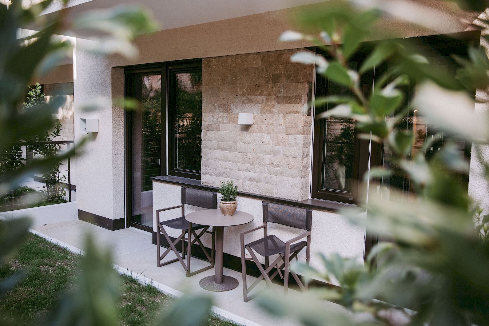 The Apartment dispone di un'ampia terrazza con mobili da esterno, un giardino privato con pergola per il relax e una doccia esterna.