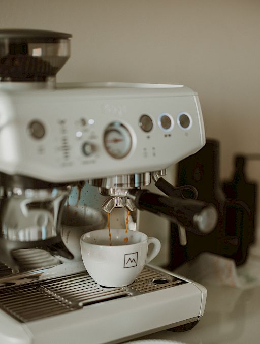 Bollitore, teiera Menu, caraffa Chemex e macchina per caffè espresso De Longhi per la colazione.