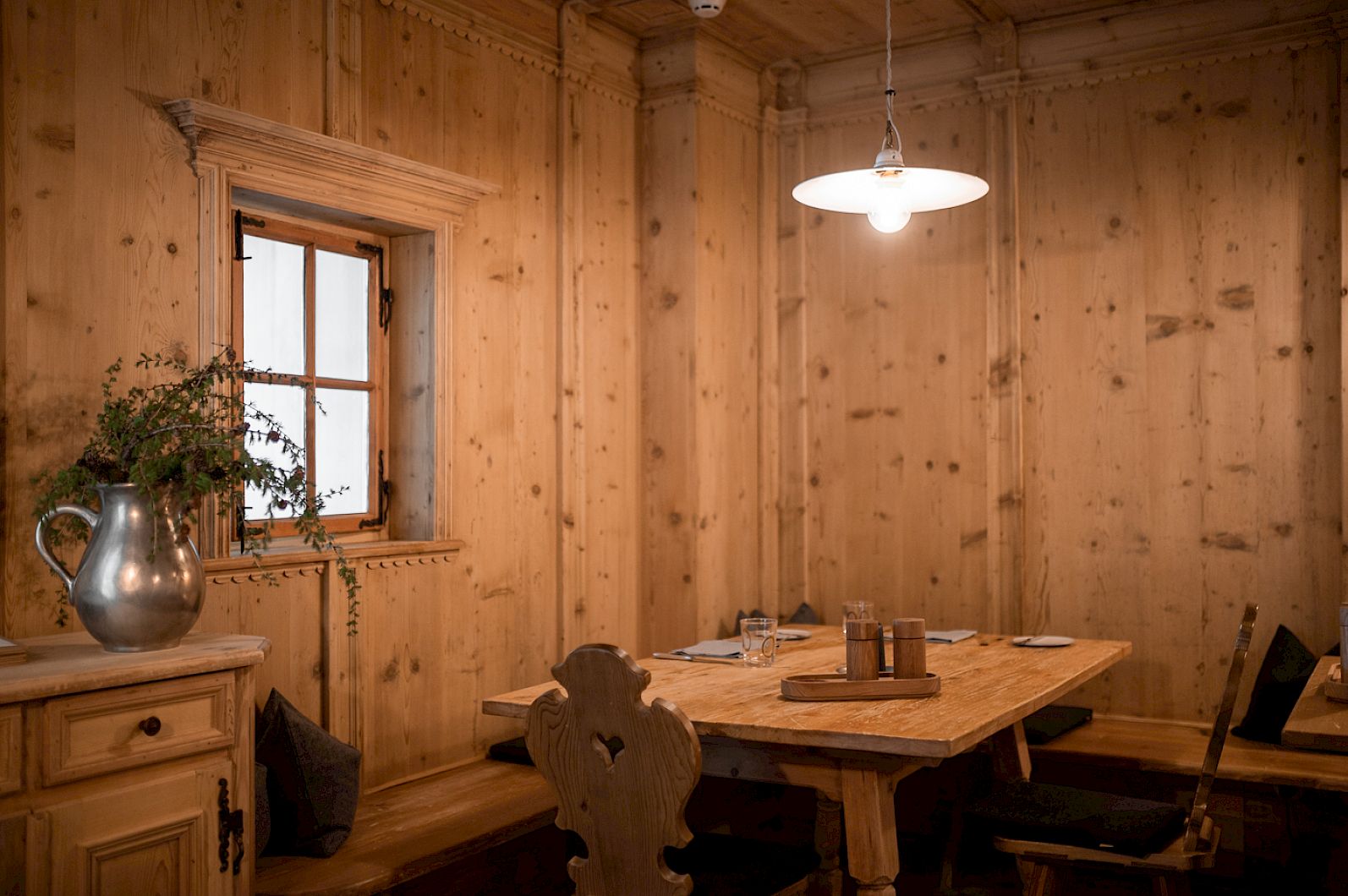 Eine andere Zeit, eine andere Welt. Oft braucht es nicht viel: Unsere holzgetäfelte Südtiroler Stube aus dem 19. Jh. verrät, was hier auf den Tisch kommt.