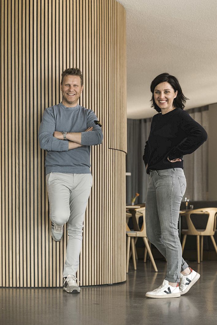 " Vielleicht noch nie haben wir Materialien, Oberflächen und Farben mit so viel Sorgfalt und bedacht ausgewählt wie bei diesem Projekt. Aus feinsten Zwischentönen und Nuancen baut sich ein leichtes und doch tief klingendes Raumerlebnis auf, das den Begegnungsbereichen im Hotel MIRAMONTI ein vielschichtiges und doch unverkennbares Gepräge verleiht",