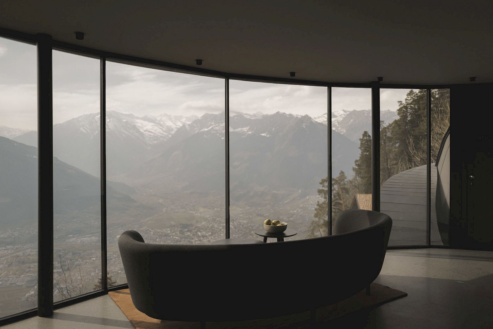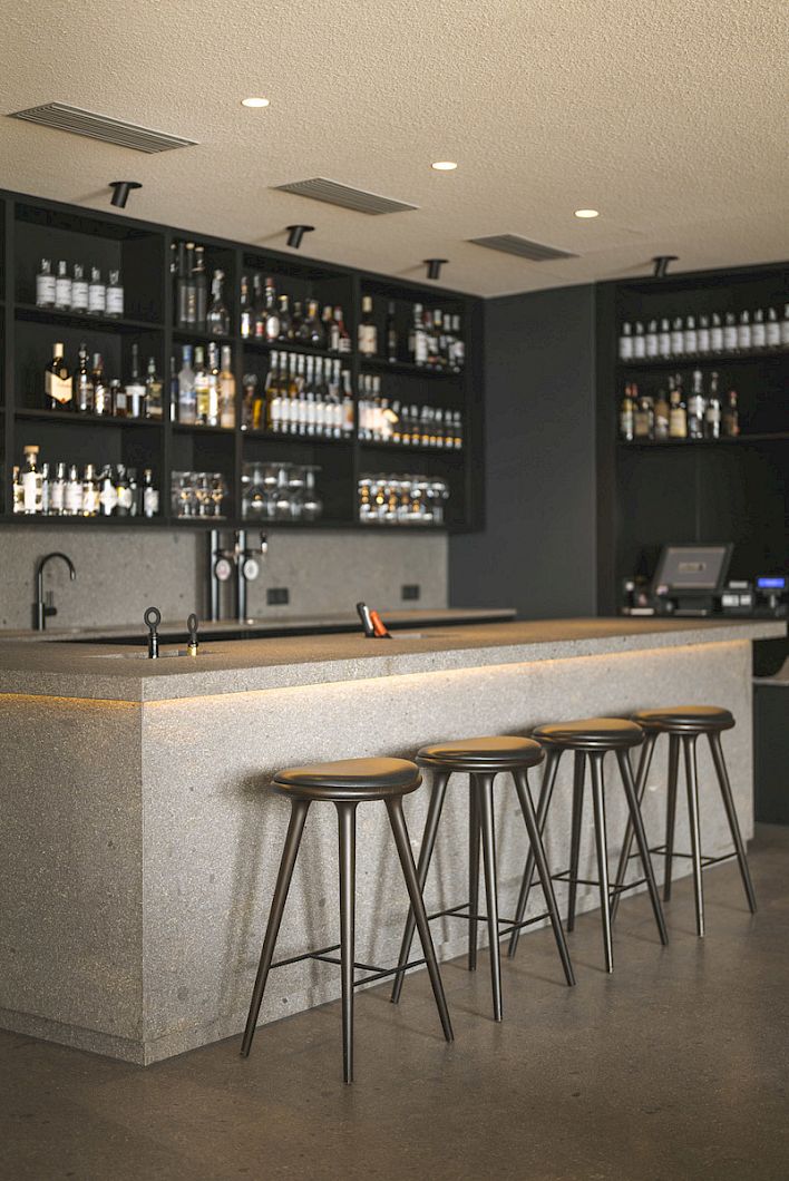 Skandinavisches Interior von Fritz Hansen, &tradition, Massproduktion, Lampen von Harry Thaler und Tonvasen geben dem gesamten Erdgeschoss, den gewünschten zurückhaltenden nordisch-japanischen Flair. Mit dem Umbau haben wir den Eingangsbereich leichter und freier gestaltet, sogar der begehbare Weinschrank findet nun dort Platz. Dem Klassik Restaurant haben wir Struktur verliehen durch viele Sitzbänke und einer offenen Kaffeebar. Das Panorama Restaurant erstrahlt in warmen Vollholztönen und neuem Mobiliar. Der wertvolle Gedanke „weniger ist mehr“ war dabei für uns entscheidend. Stets mit dem Bewusstsein, die Einflüsse der Natur einzubinden. Das massive Porphyrgestein spiegelt die Kraft und Beständigkeit dieser Umgebung wider. Der Einsatz von warmen Materialien wie Eichenholz, Leinen, Naturstein, individuelles Handwerk und die auffälligen schwarzen Elemente im Haus erzeugen einen wunderbaren Kontrast mit Haptik. Die Kombination, zwischen klassischen Designer Möbeln und natürlichen Holzkonstruktionen, bewirkt eine harmonische Atmosphäre. Die Fensterfronten für den eindrucksvollen Ausblick waren ein absolutes „Must-Have“. Der Tea Room mit eigenen offenen Kamin, die neue Kaminlounge und die MIRAMONTI Bar profitieren davon ganz besonders.