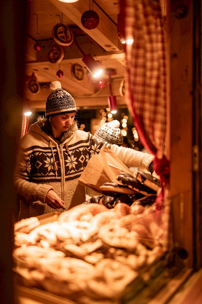 Schön dekorierte Stände mit traditionellem Handwerk, Christbaumschmuck und Südtiroler Köstlichkeiten erwarten Sie.
