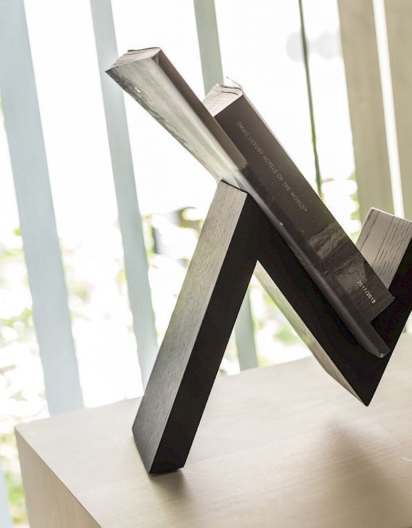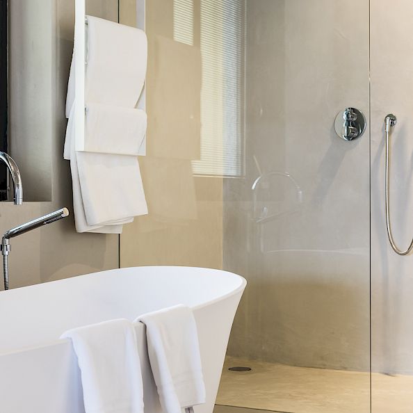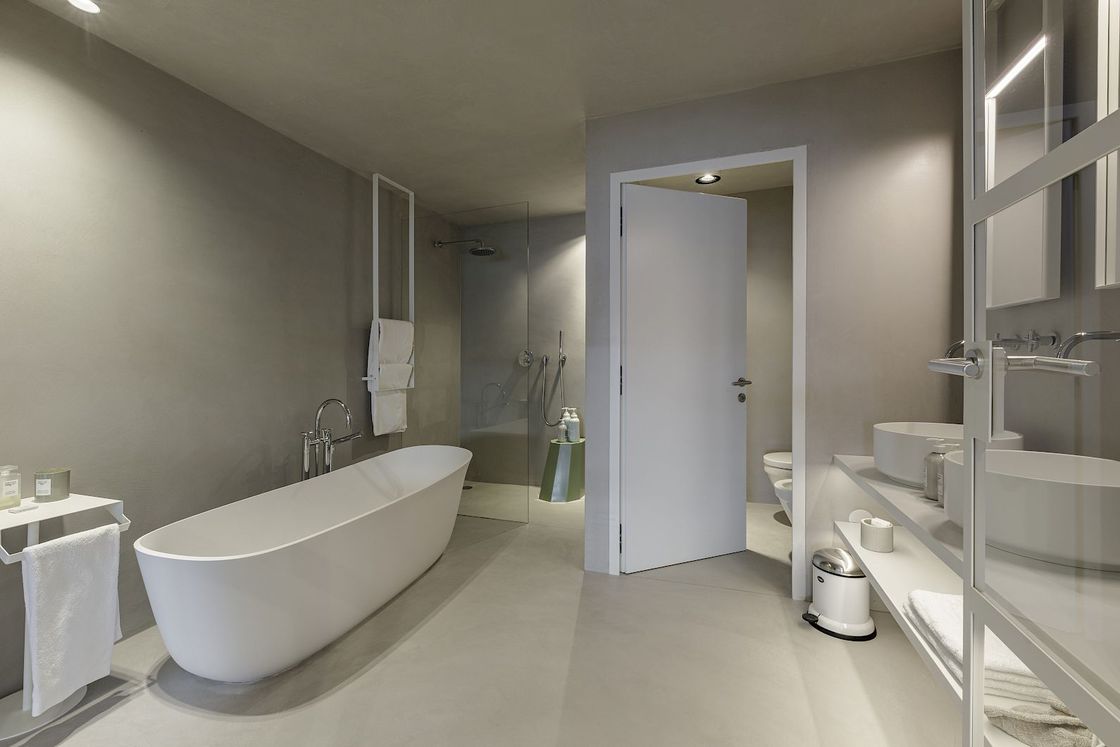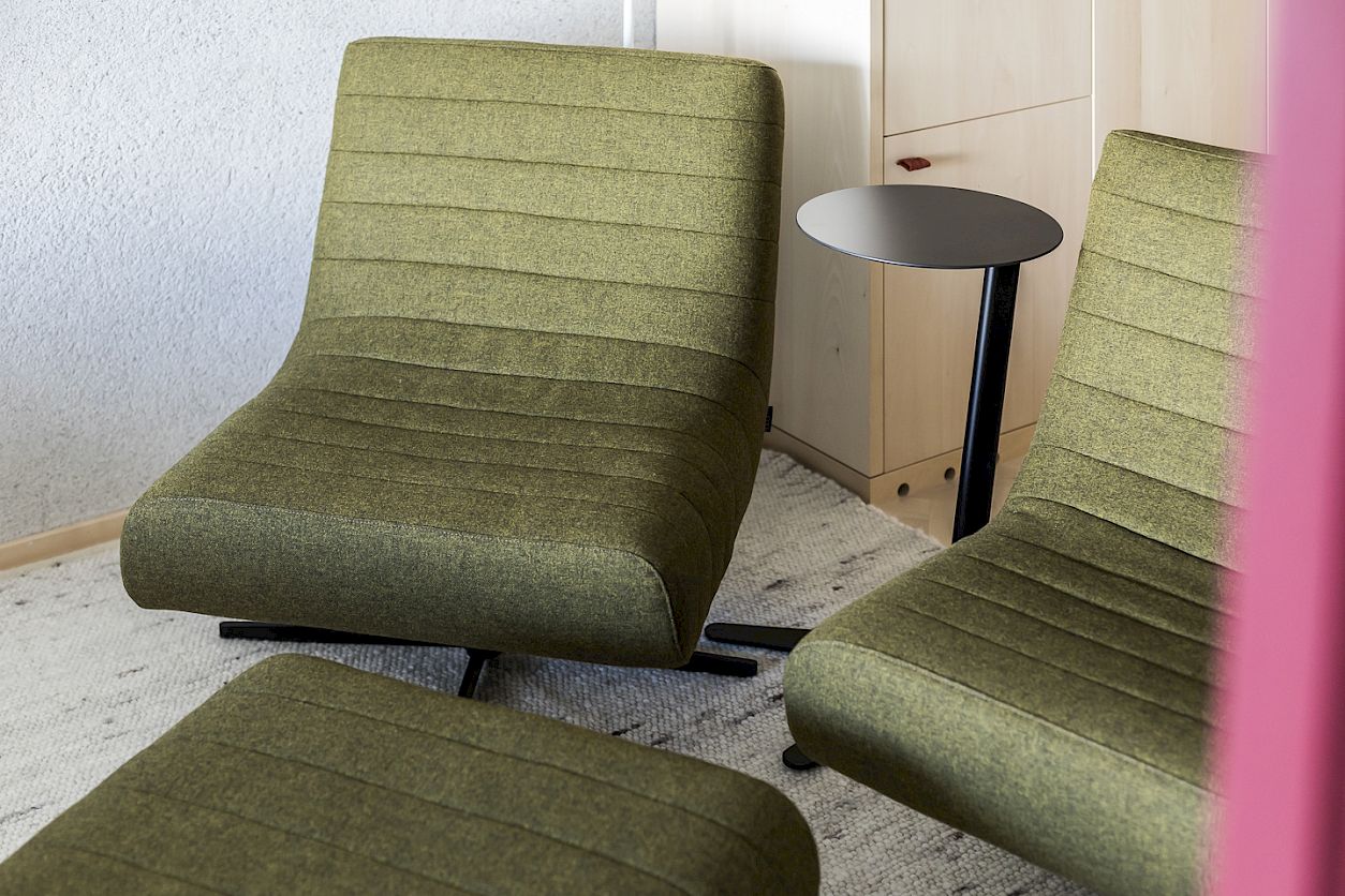 Offener Rüegg Holzkamin, Südbalkon, Badezimmer mit freistehender Badewanne, Lounge Sessel zum Relaxen, Schreibtisch, Holzboden in Fischgradverlegung, Zement-Lehm-Verputz, Wandverkleidung und Sessel mit original Mössmer-Stoffe und Lampen vom Südtiroler Designer Debiasi Sandri.