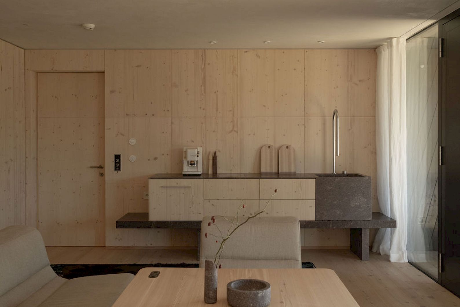 Mit hellem naturbelassenem heimischem Fichtenholz und rötlichem Porphyr.
