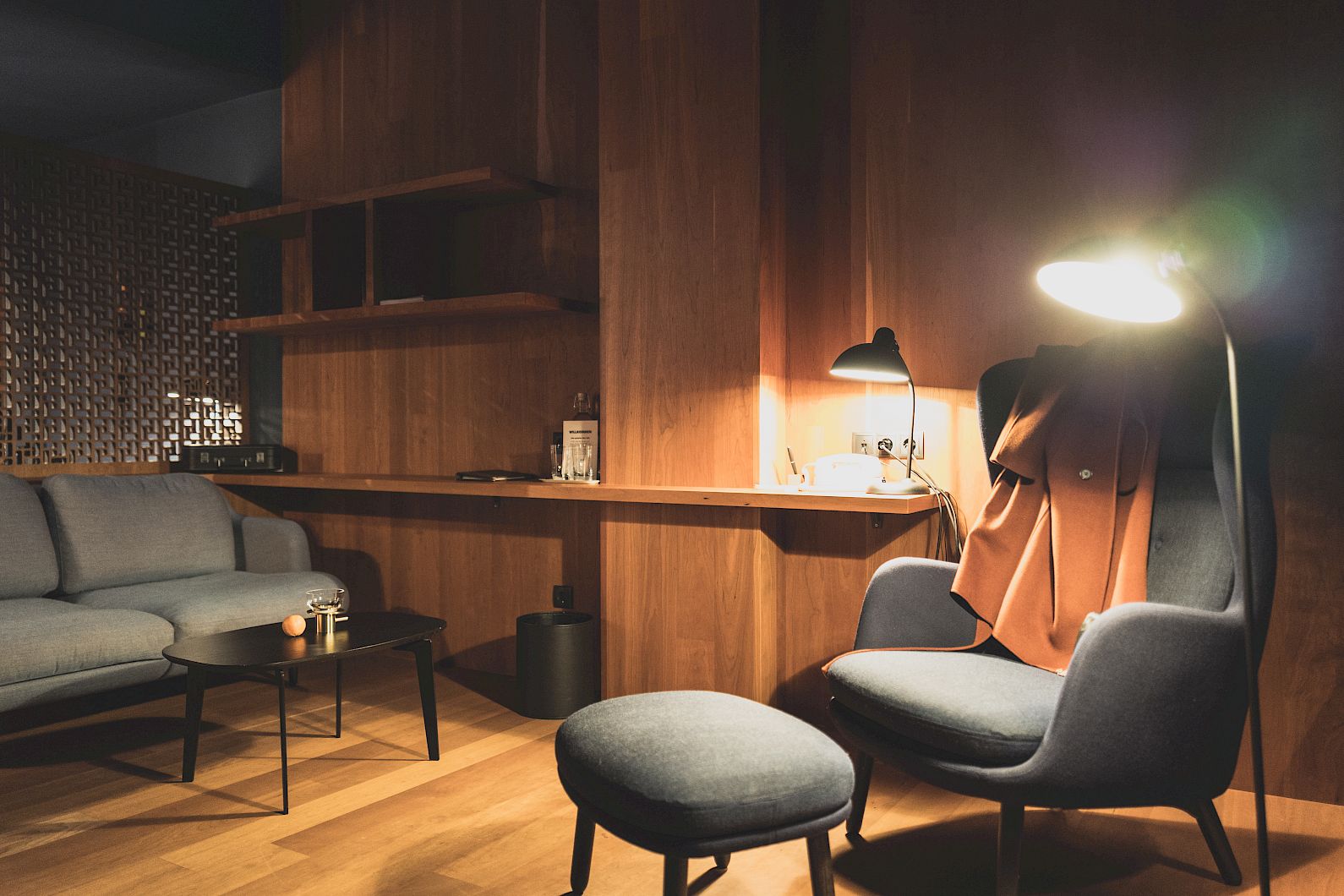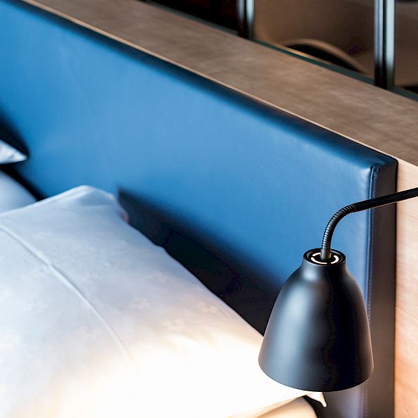 Cherry wood meets elegant midnight blue, the bed opposite the floor-to-ceiling glass front, south-facing balcony in glass, desk, original Fritz Hansen furniture, the roof garden with cherry wood and skylight.