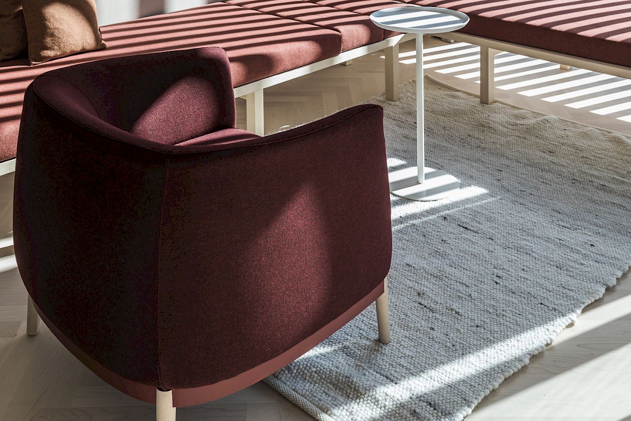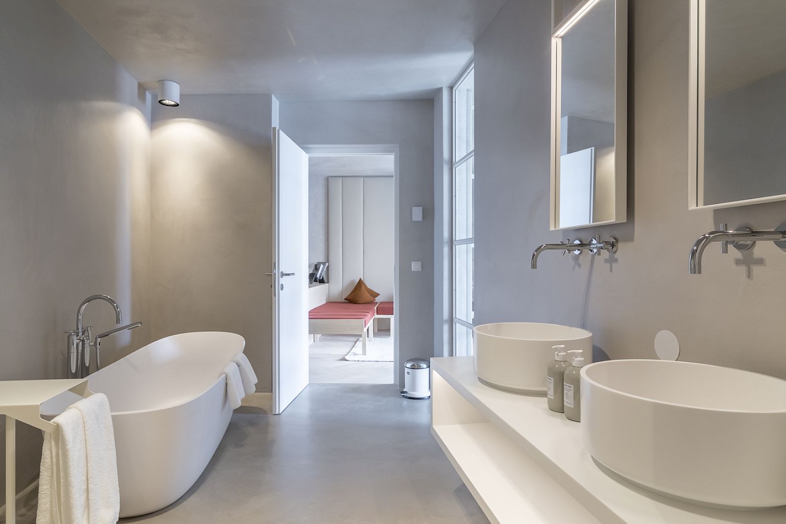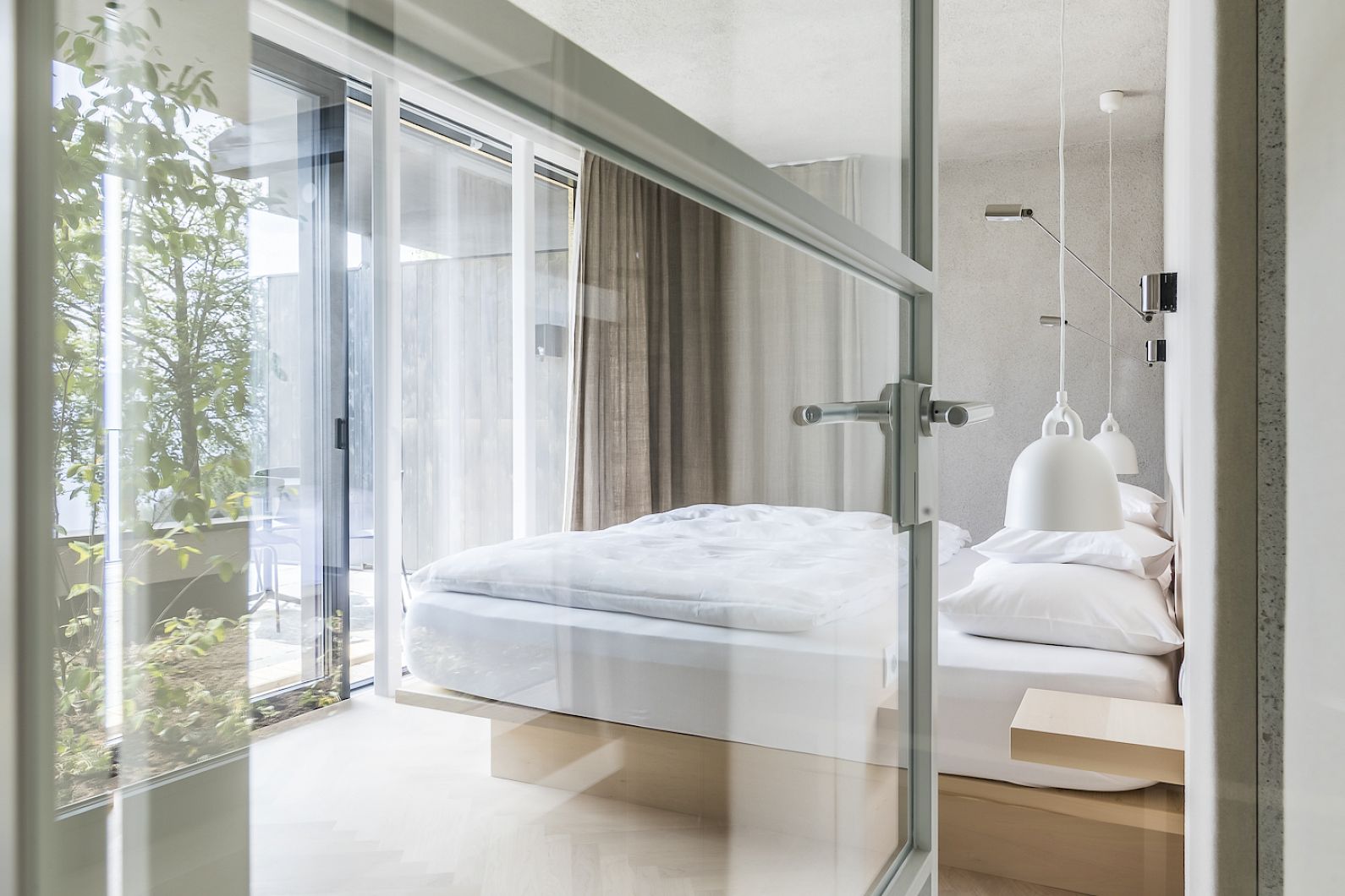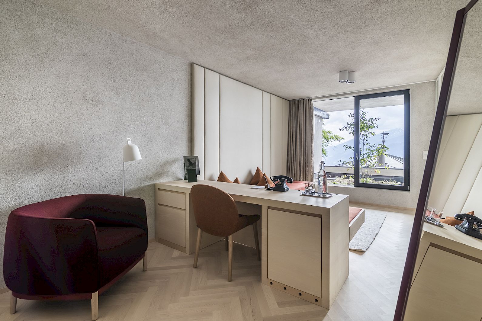 Two-room experience, south-facing balcony with private garden corner, the bed facing the floor-to-ceiling glass front, bathroom with free-standing bathtub, daybeds for relaxing, desk, herringbone-laid wooden floor, cement plaster, upholstery and armchairs with original Mössmer fabrics and lamps by South Tyrolean designer Debiasi Sandri.