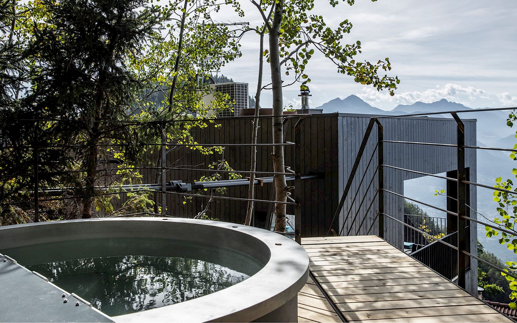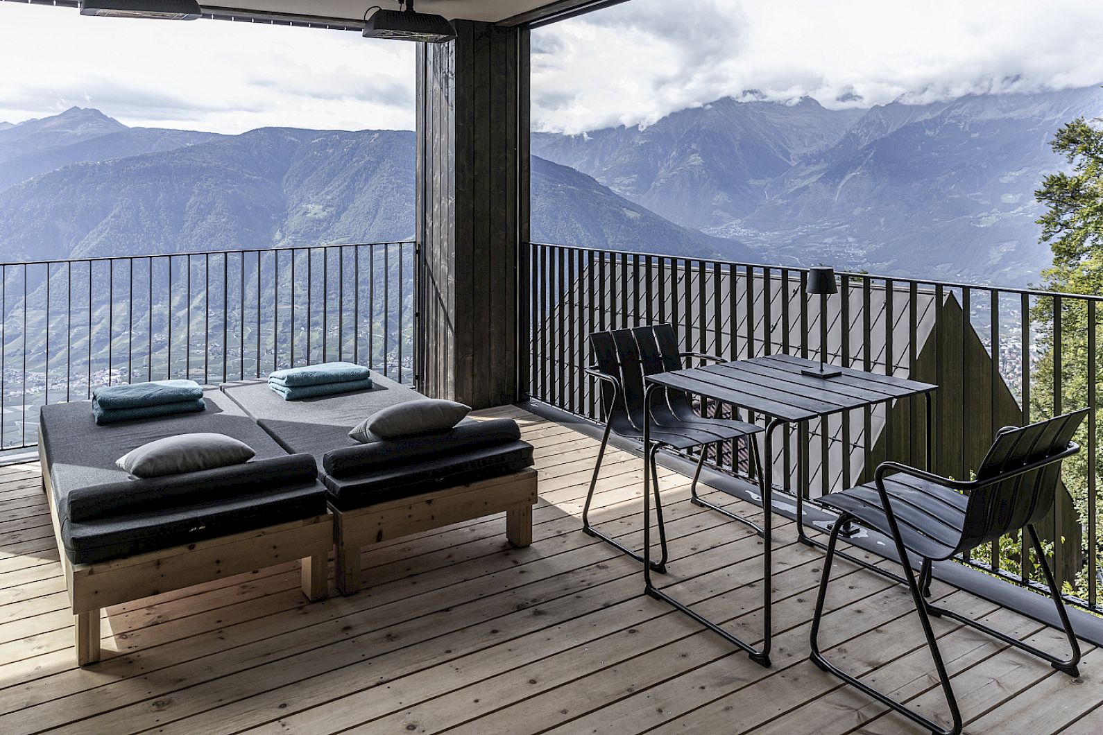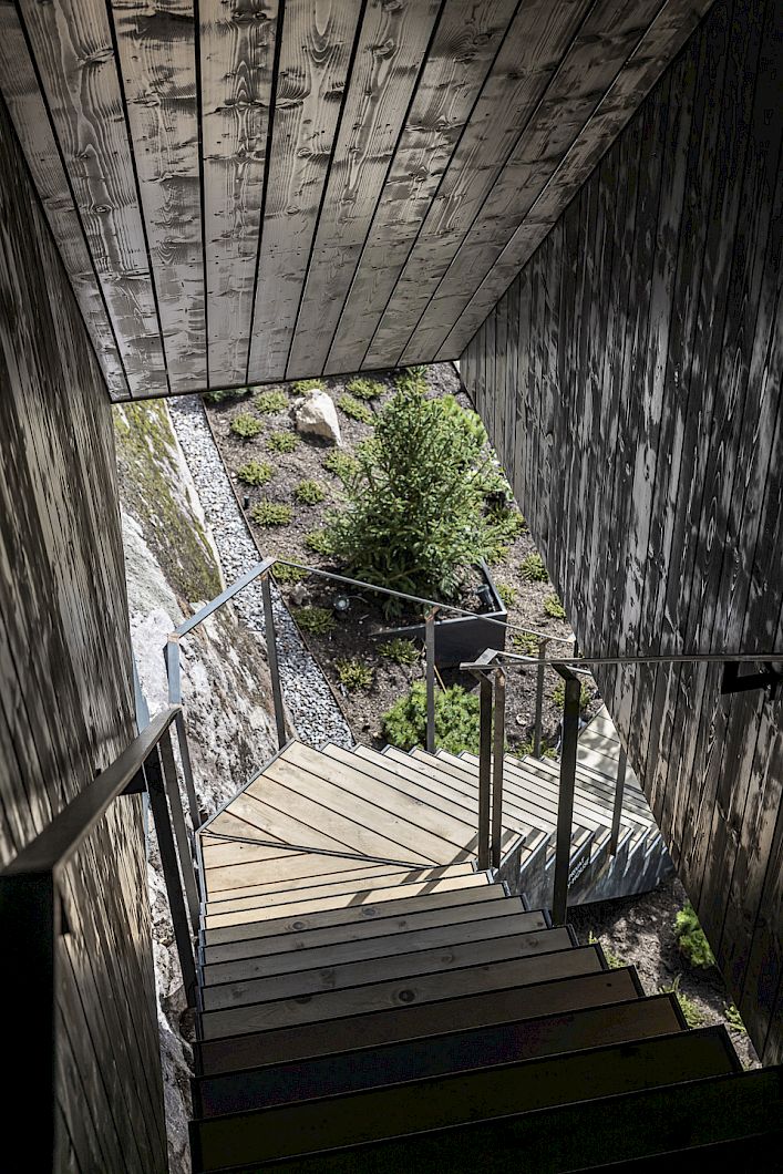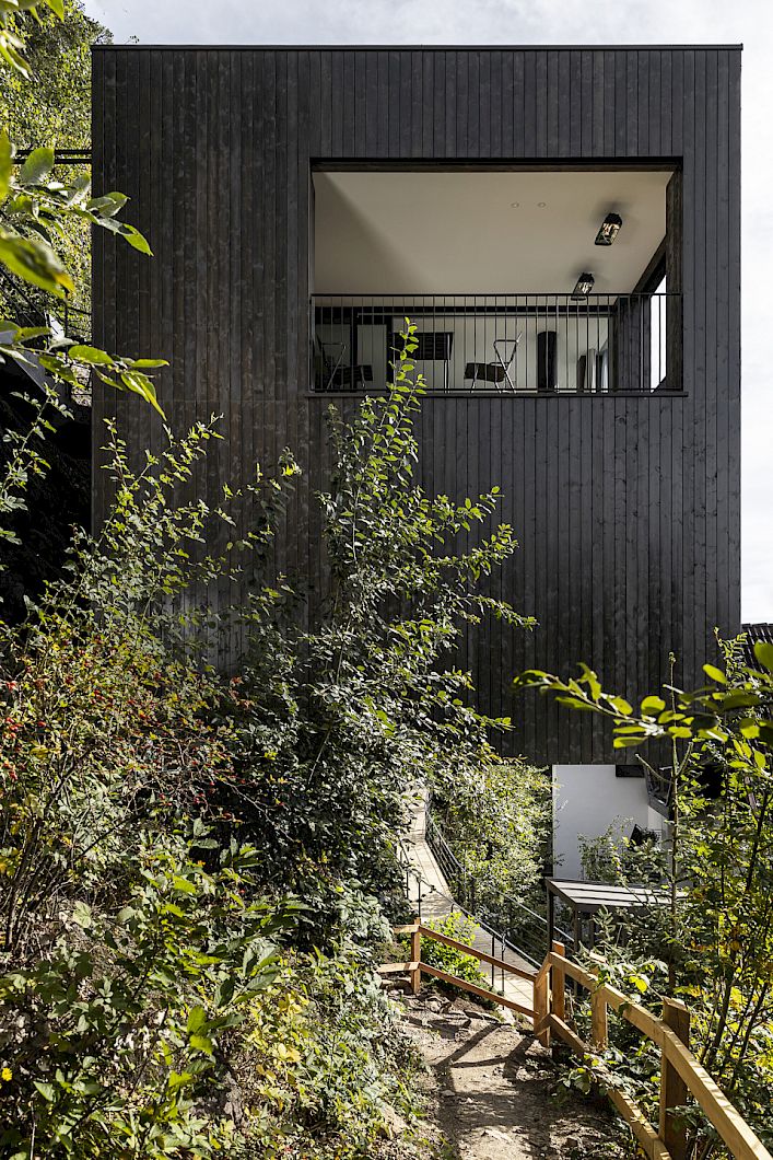 Secret Escape - A stand-alone, two-storey wooden cube. Floating above the roofs of the MIRAMONTI, firmly anchored to the porphyry rock face with six tension ropes. Downstairs: the bedroom with Hasten's bed and the large bathroom facing the rock. Upstairs: The living room with open fireplace and dining table. Outside: The covered south-facing terrace with wooden loungers and access to the private Hot Pot.