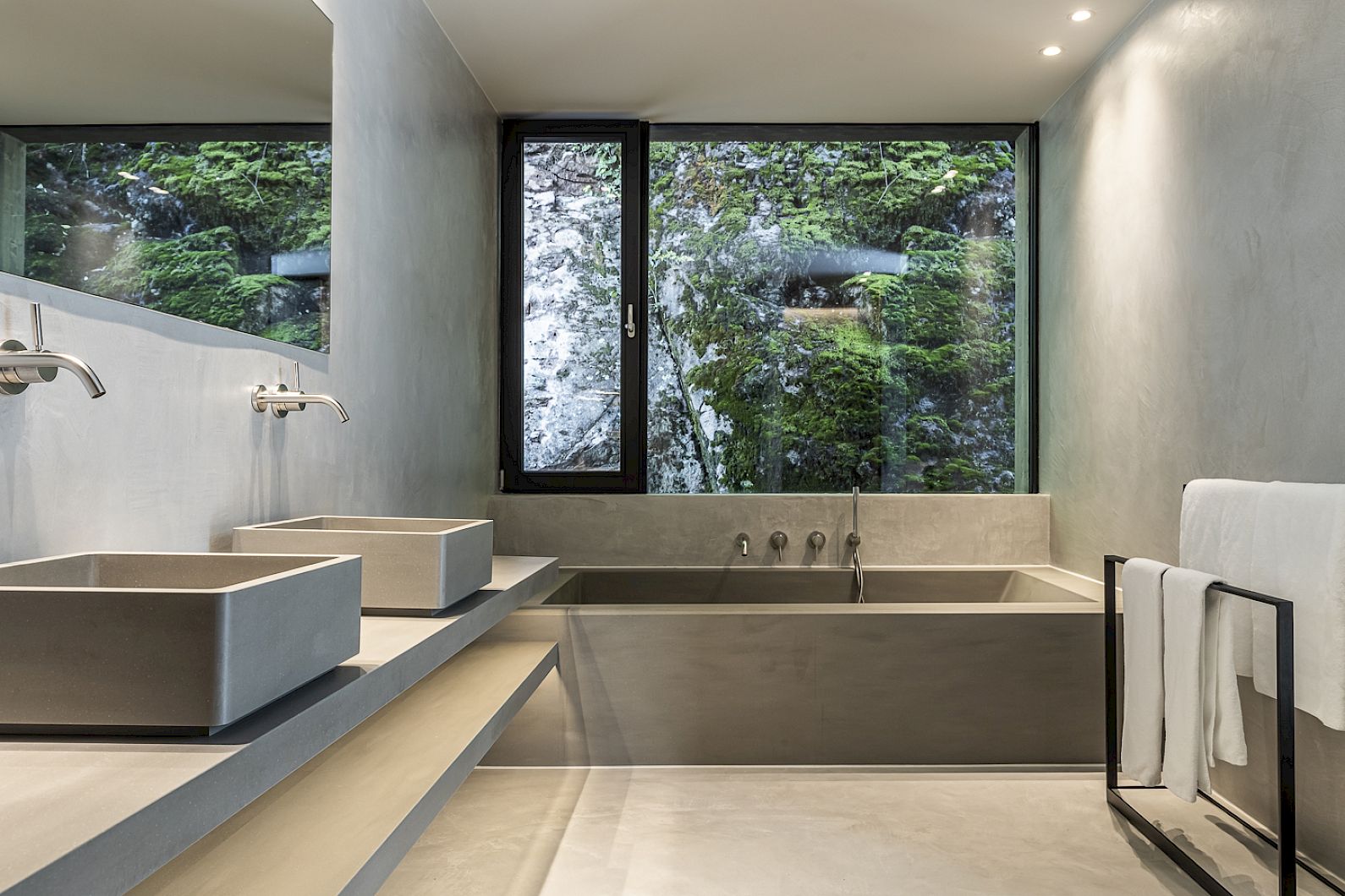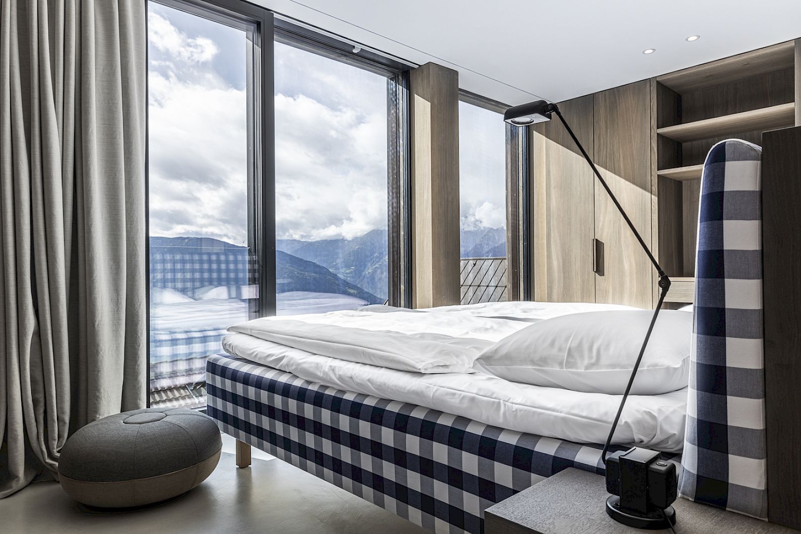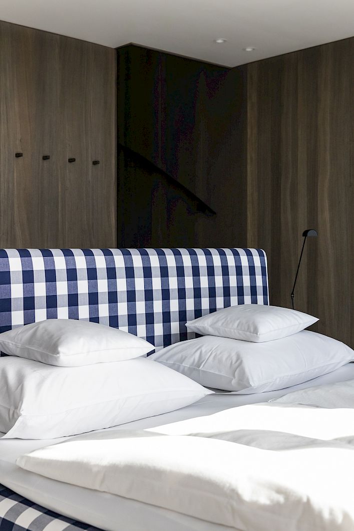 Secret Escape - A stand-alone, two-storey wooden cube. Floating above the roofs of the MIRAMONTI, firmly anchored to the porphyry rock face with six tension ropes. Downstairs: the bedroom with Hasten's bed and the large bathroom facing the rock. Upstairs: The living room with open fireplace and dining table. Outside: The covered south-facing terrace with wooden loungers and access to the private Hot Pot.