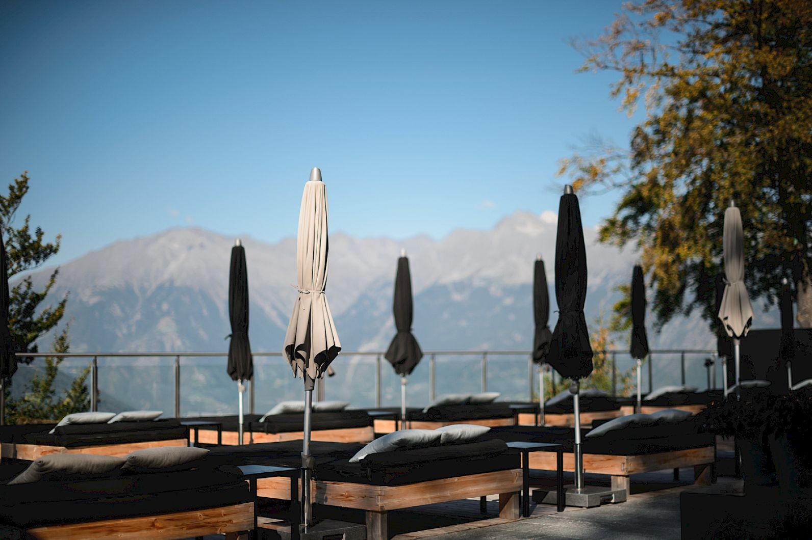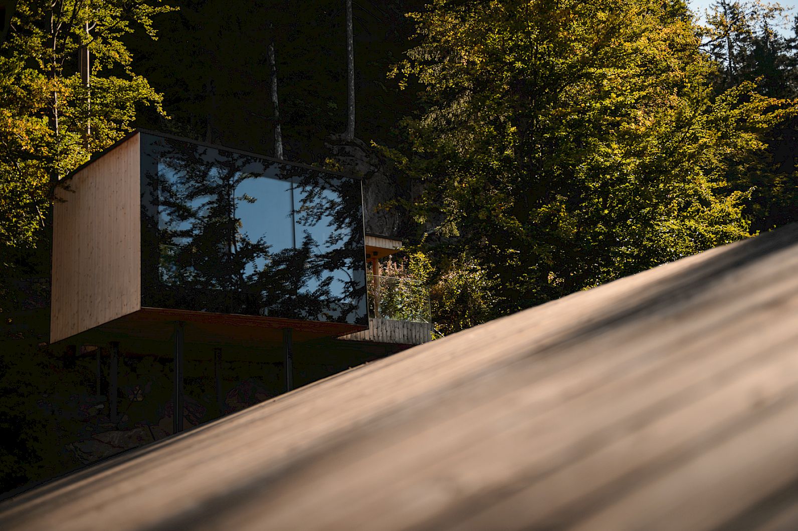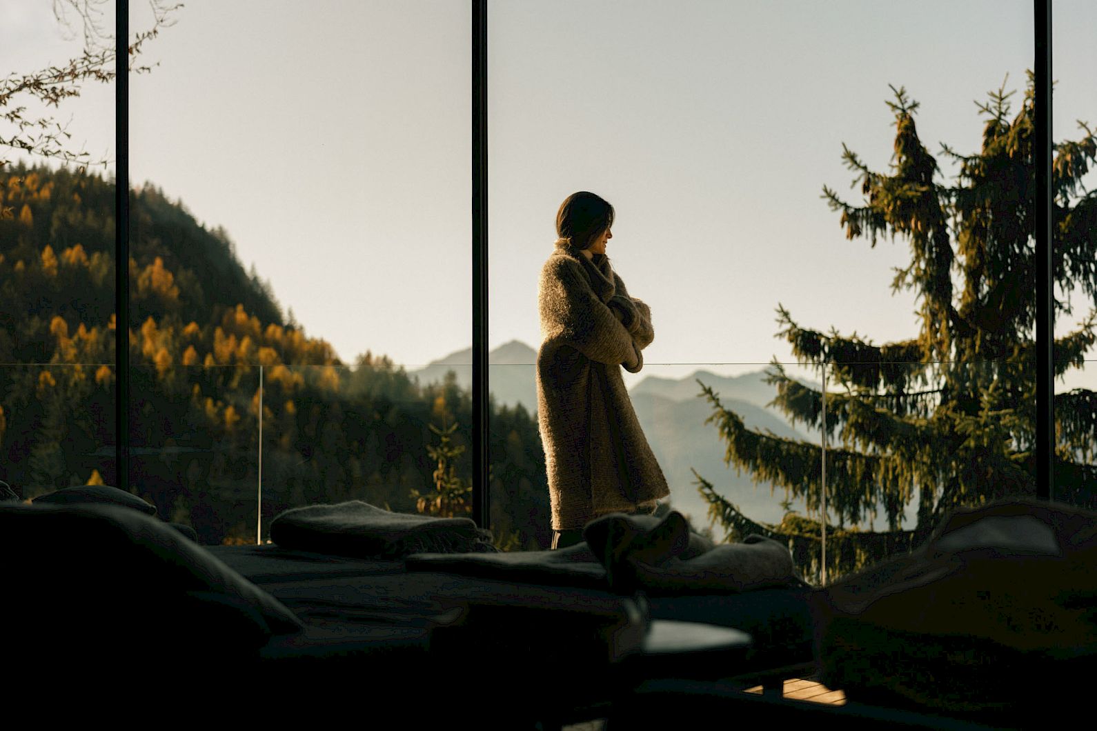 The staircase leads seamlessly to the salt-water infinity pool. Volcanic rock and Pfitscher silver quartzite that is thousands of years old. The silence by the open fire in the relaxation house and in the library. Privacy in the jacuzzi with forest views. The magic of the Swedish forest sauna, just 36 steps away. The breadth of the wind-sheltered sun terrace. The spirit of the fitness studio.
