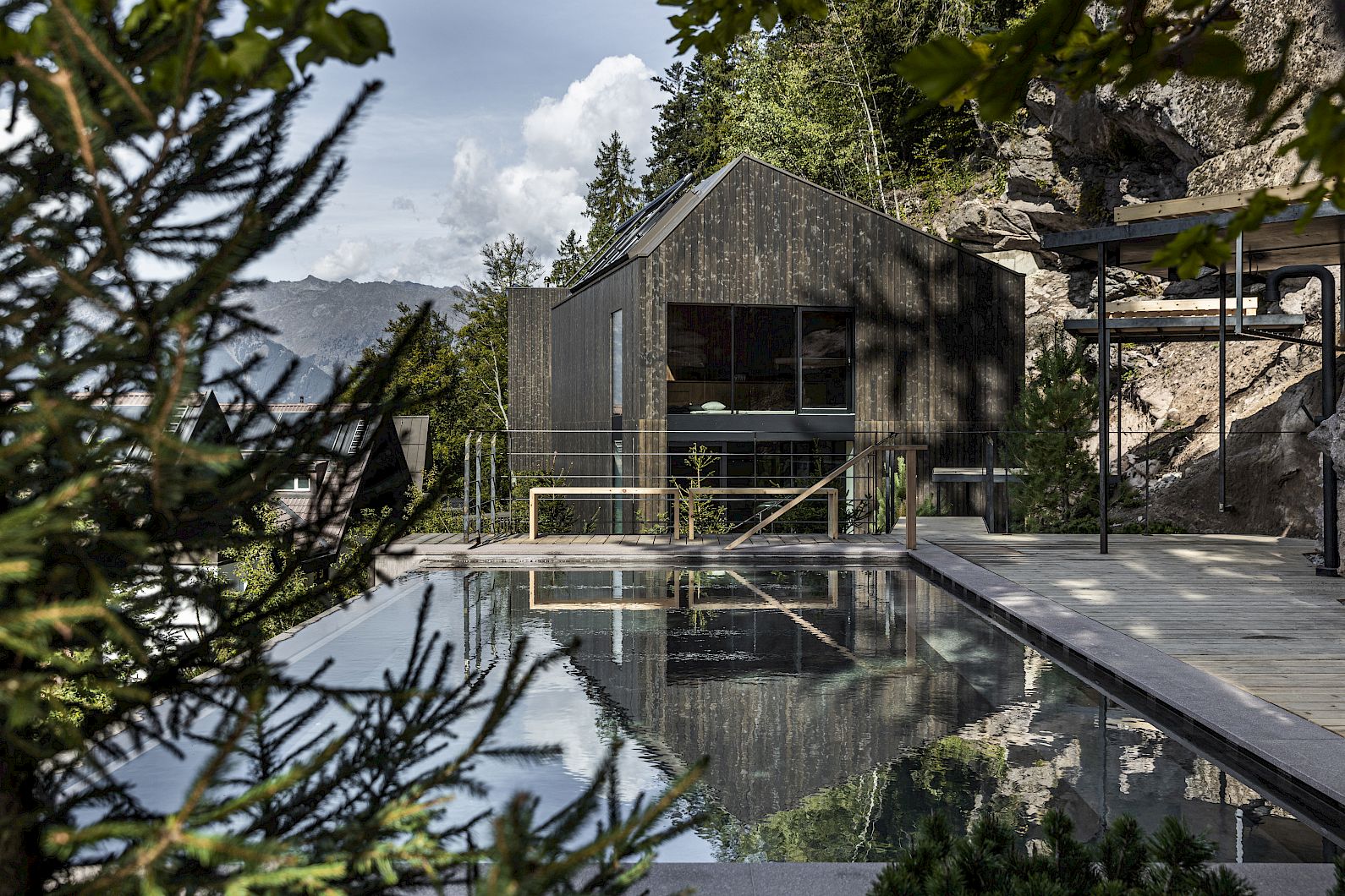 Planned by the Tara architects Heike Pohl and Andreas Zanier and built by local craftsmen, our ONSEN POOL brings together two worlds: Japanese bathing and alpine recreation. Solid safety of South Tyrolean porphyry stone and weightless floating in warm water. The ancient ritual of bathing and resting on our solar platforms surrounded by the rugged rock.