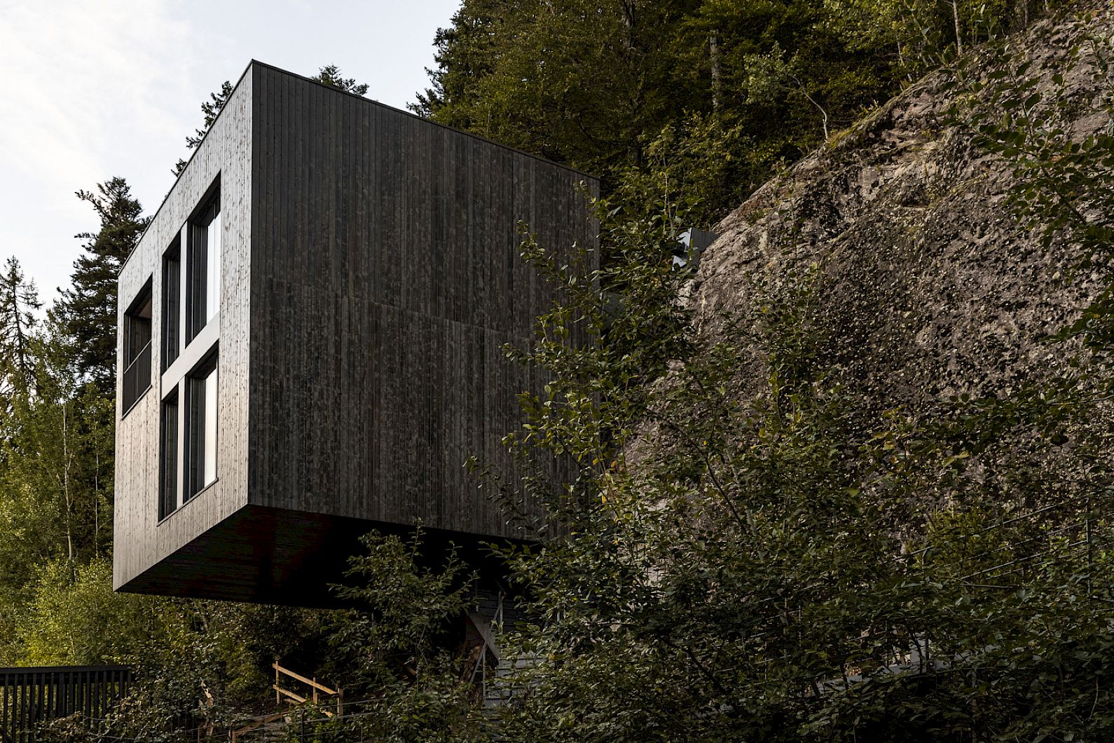 Ancorata con 6 funi alla roccia porfirica. Collegata con un ponte privato al quarto piano dell’hotel, la Sky House è un Hideaway Home autosufficiente. Un cubo in legno sospeso sopra al MIRAMONTI. Un gioiello unico per gli amanti della natura.