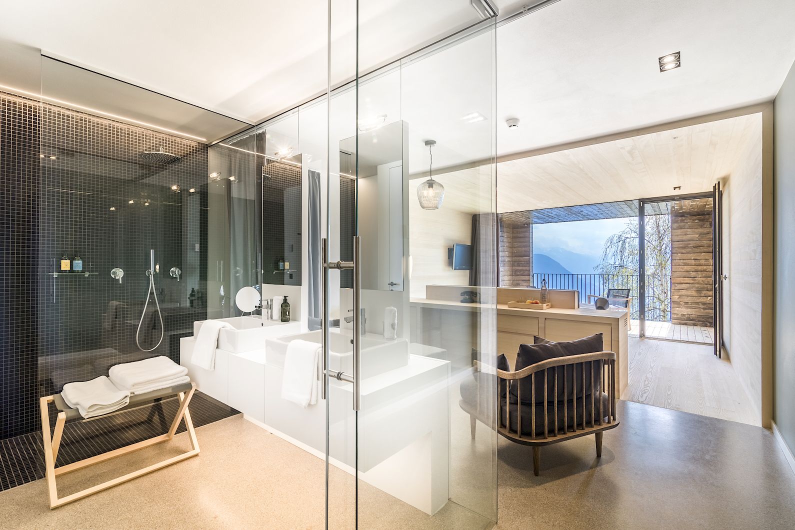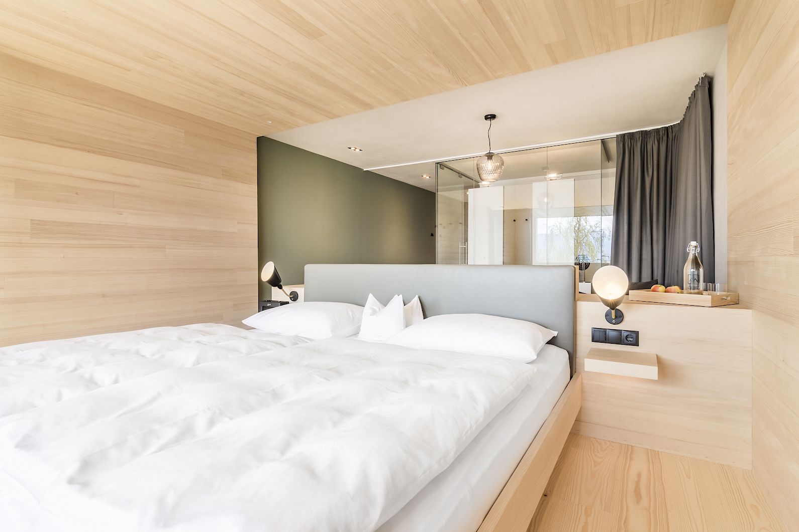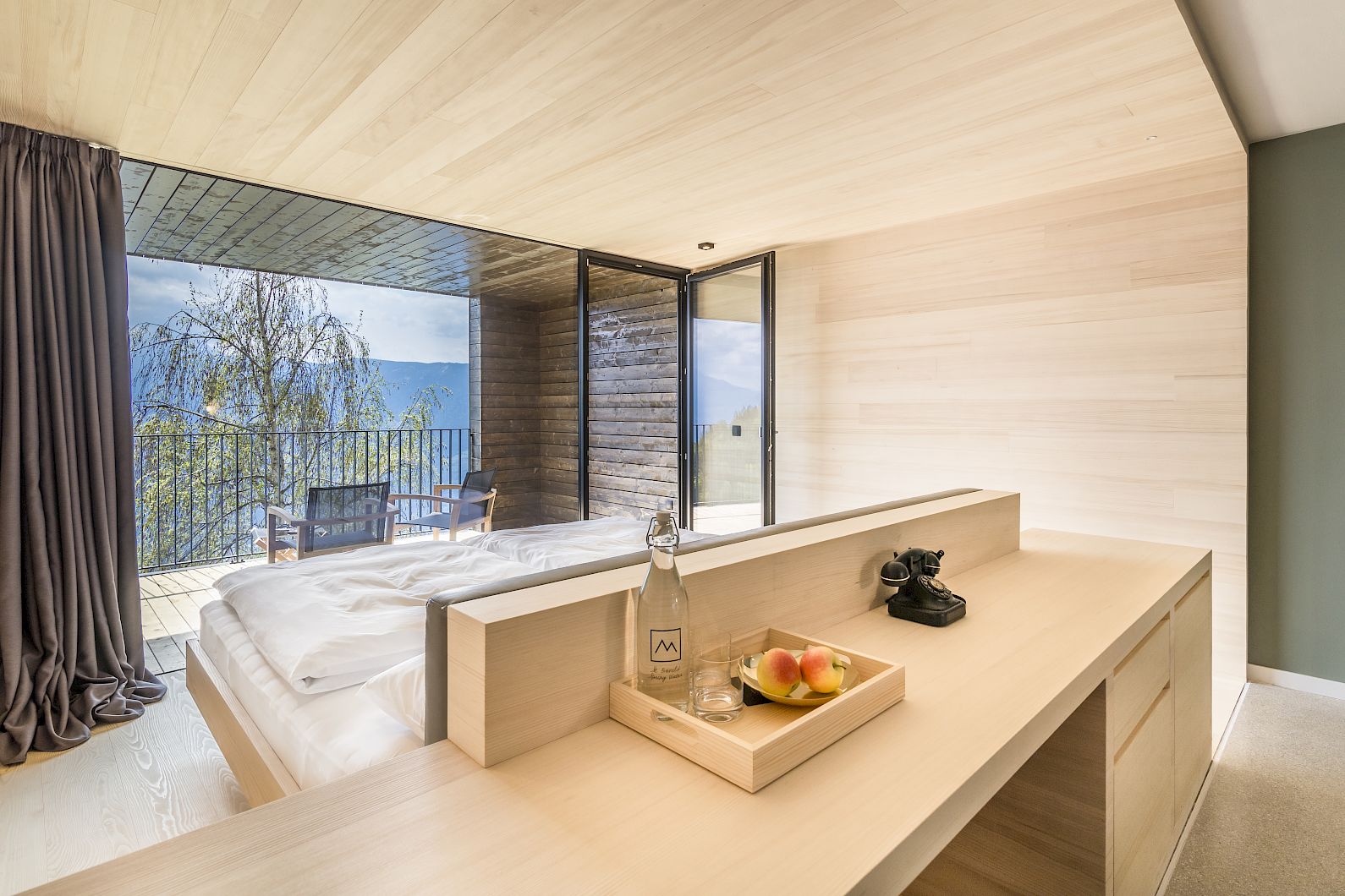 Il letto si affaccia sulla finestra a parete, il balcone rivolto a sud, la scrivania, il bagno a pianta aperta, l'abete bianco locale, il pavimento in cemento lucidato, le poltrone e le lampade di &Tradition - un'azienda di Copenhagen.