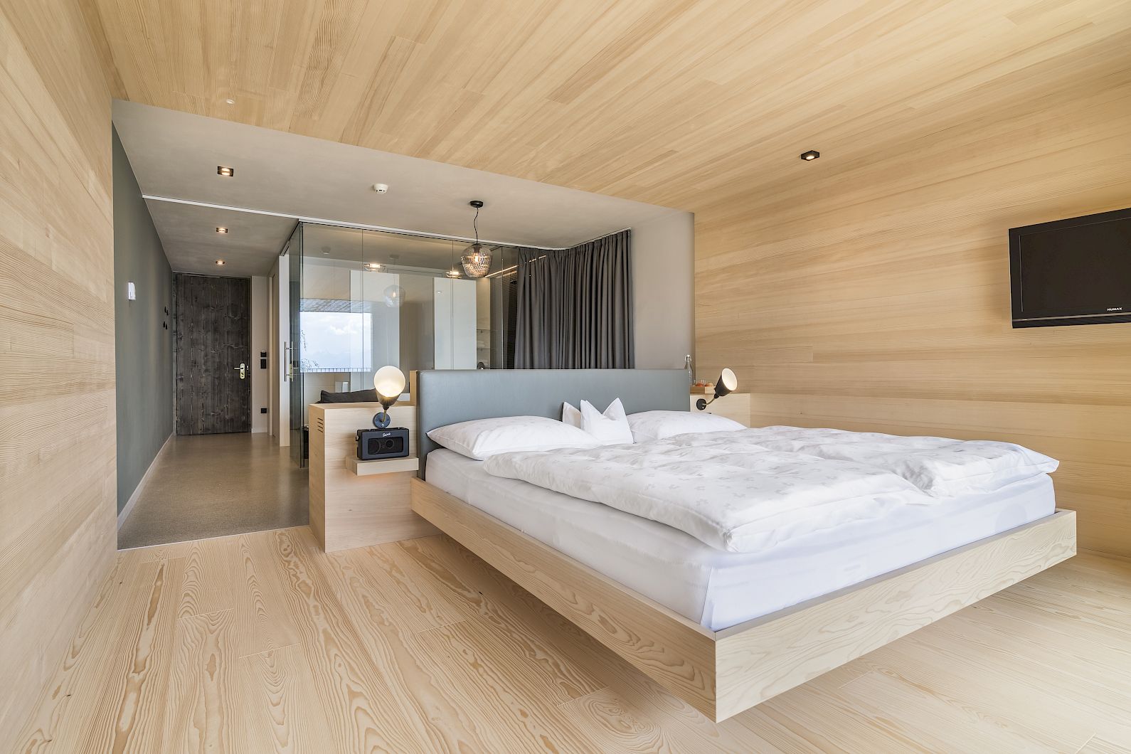 Il letto si affaccia sulla finestra a parete, il balcone rivolto a sud, la scrivania, il bagno a pianta aperta, l'abete bianco locale, il pavimento in cemento lucidato, le poltrone e le lampade di &Tradition, un'azienda di Copenaghen.
