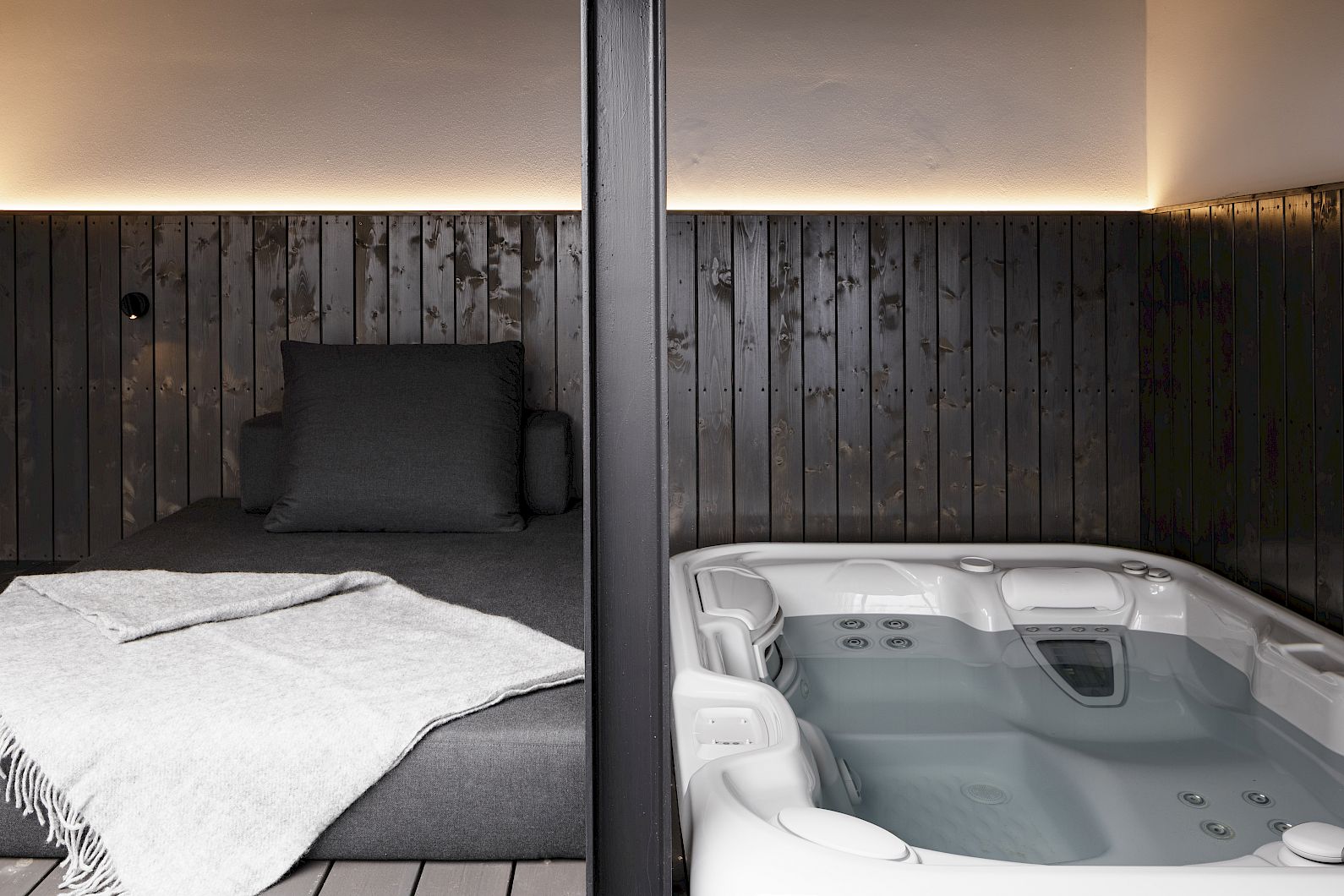 Rifugio all'ultimo piano della casa, terrazza esposta a sud con vasca idromassaggio privata, il letto al centro di fronte alla finestra a parete lunga 9 m, bagno con cabina doccia e vista sulla città di Merano, cabina bar in legno di noce, sedie classiche da salotto e tavolo da pranzo di “Knoll International”.
