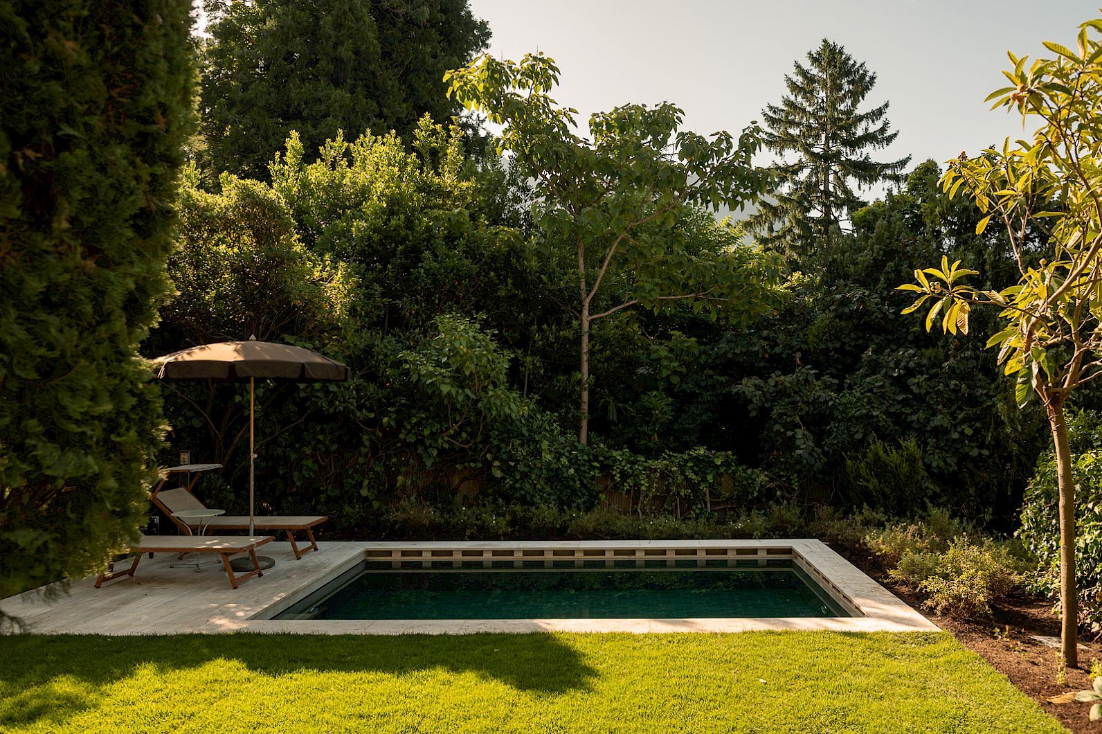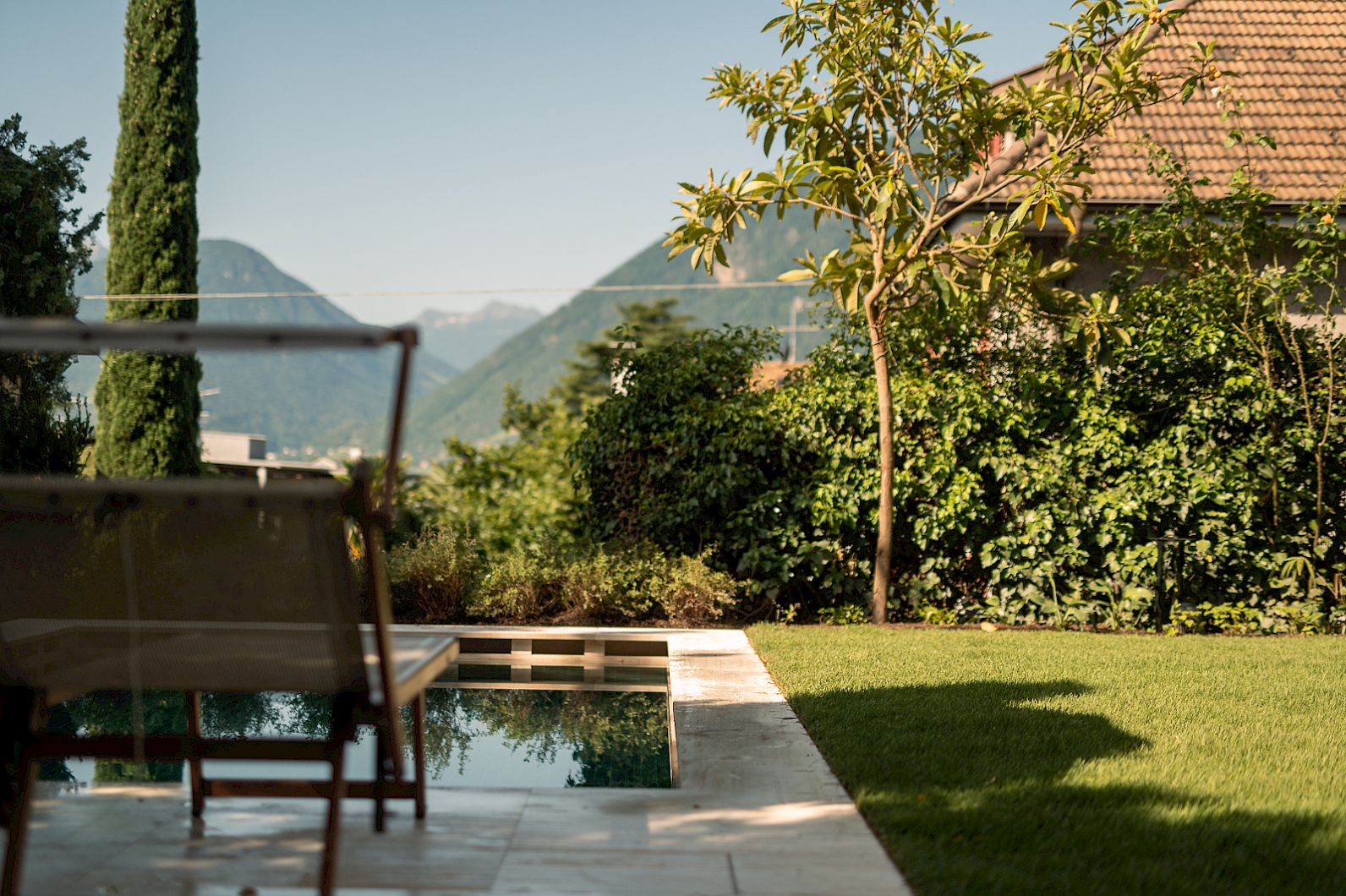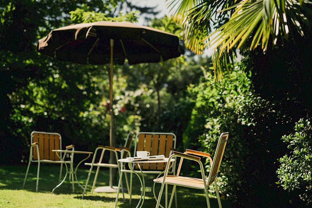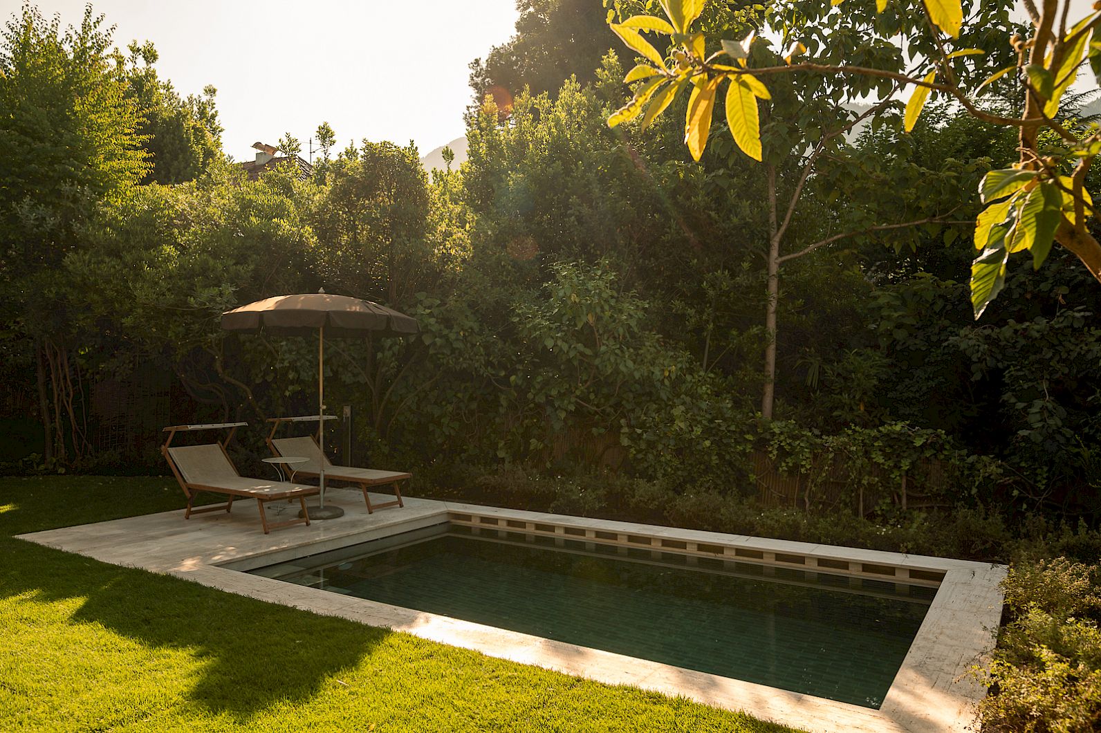 Il giardino privato di Villa Fluggi (800 m²) ha una propria piscina con acqua salata (riscaldato tutto l'anno) e possibilità di rilassarsi sul bel prato verde.