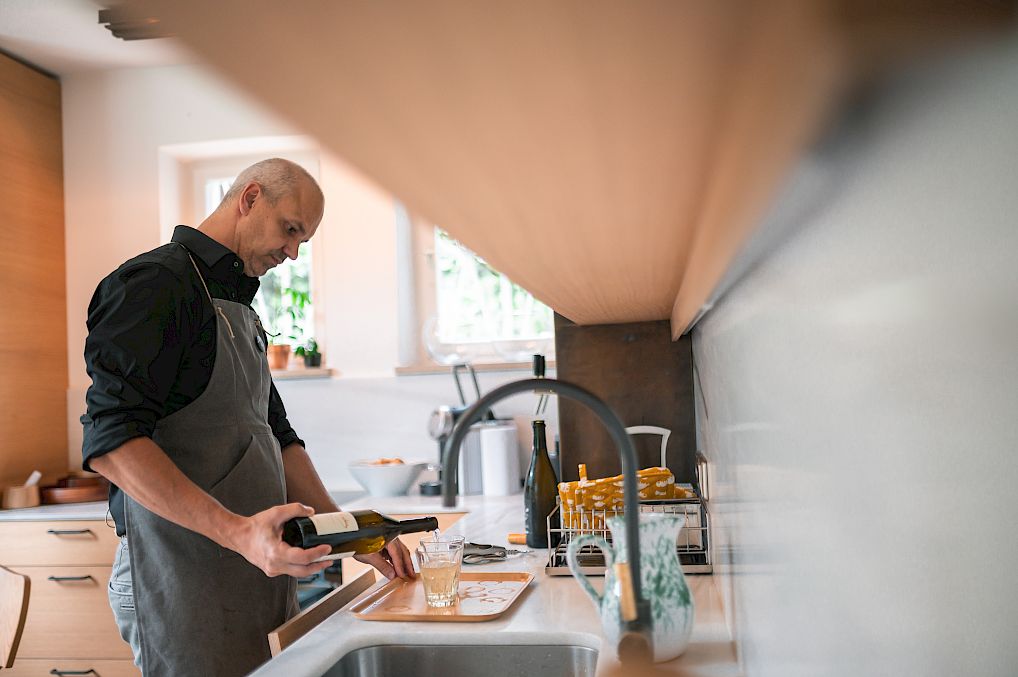 La cantina si trova nel seminterrato e offre vini altoatesini selezionati.