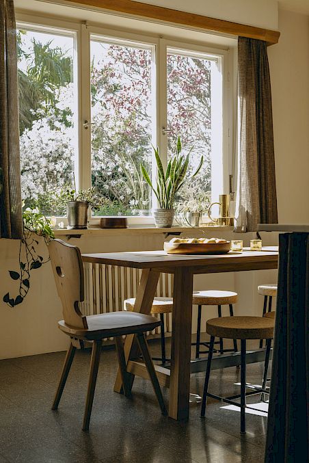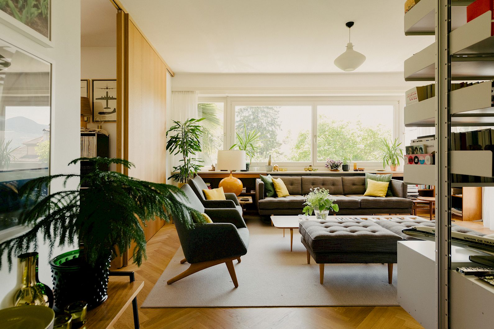 Un lungo tavolo da pranzo può ospitare fino dieci persone su bellissime sedie Thonet. Il soggiorno è arredato con un intramontabile divano Florence Knoll e un mobile bar creato da Harry Thaler.